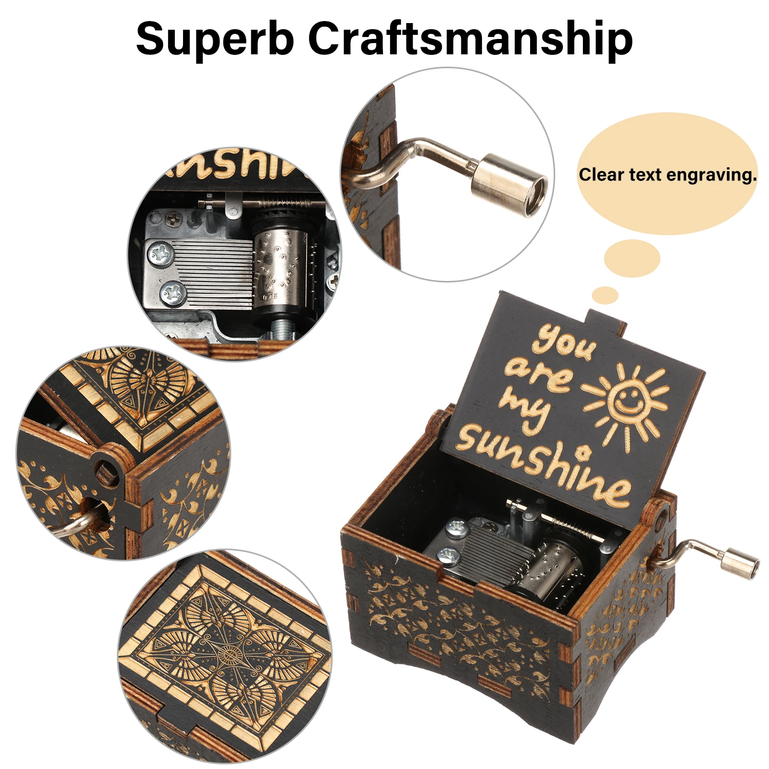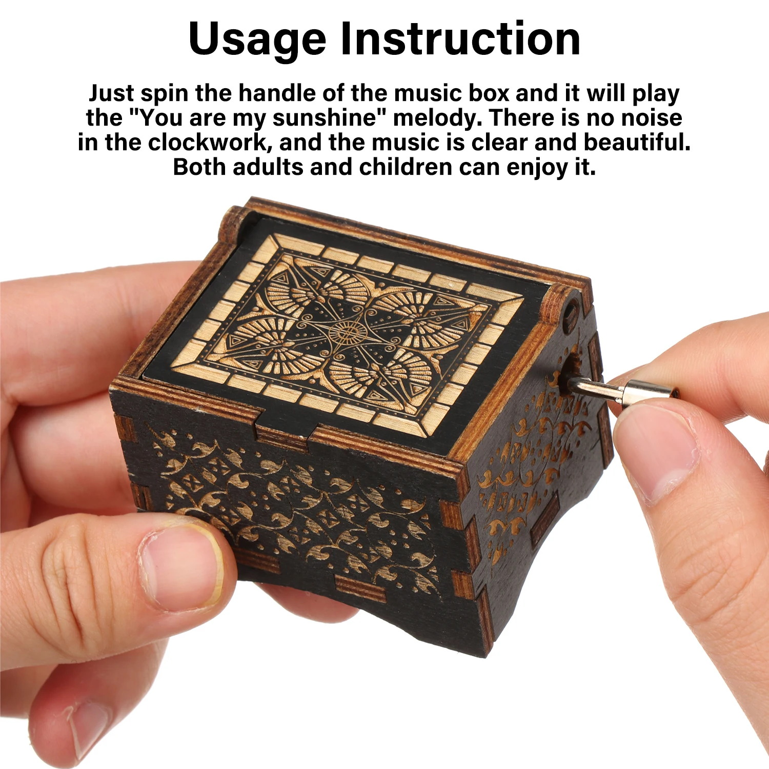 Музыкальная шкатулка с рукояткой: простая Музыкальная шкатулка с ручным креплением-это моя музыкальная шкатулка sunshine, просто поверните ручку, чтобы воспроизвести эту известную мелодию; Без работы от аккумулятора. Винтажный резной дизайн: деревянная музыкальная шкатулка с изысканным и ретро рисунком гравировки поверхности, делает ее похожей на древнюю магическую коробку с сокровищами. Интерьер красиво окрашен узорами и текстом, что дарит сюрприз и хорошее настроение. Высококачественный материал: выбор высококачественной древесины для гравировки, средний и мягкий материал s, специальные рисунки в стиле гравировки, ясно, что вы моя музыкальная Мелодия солнечного света. Идеальный дизайн и отличный подарок: красиво вырезанная, милая мелодия, хороший подарок для мамы, жены, дочери и сына. Это