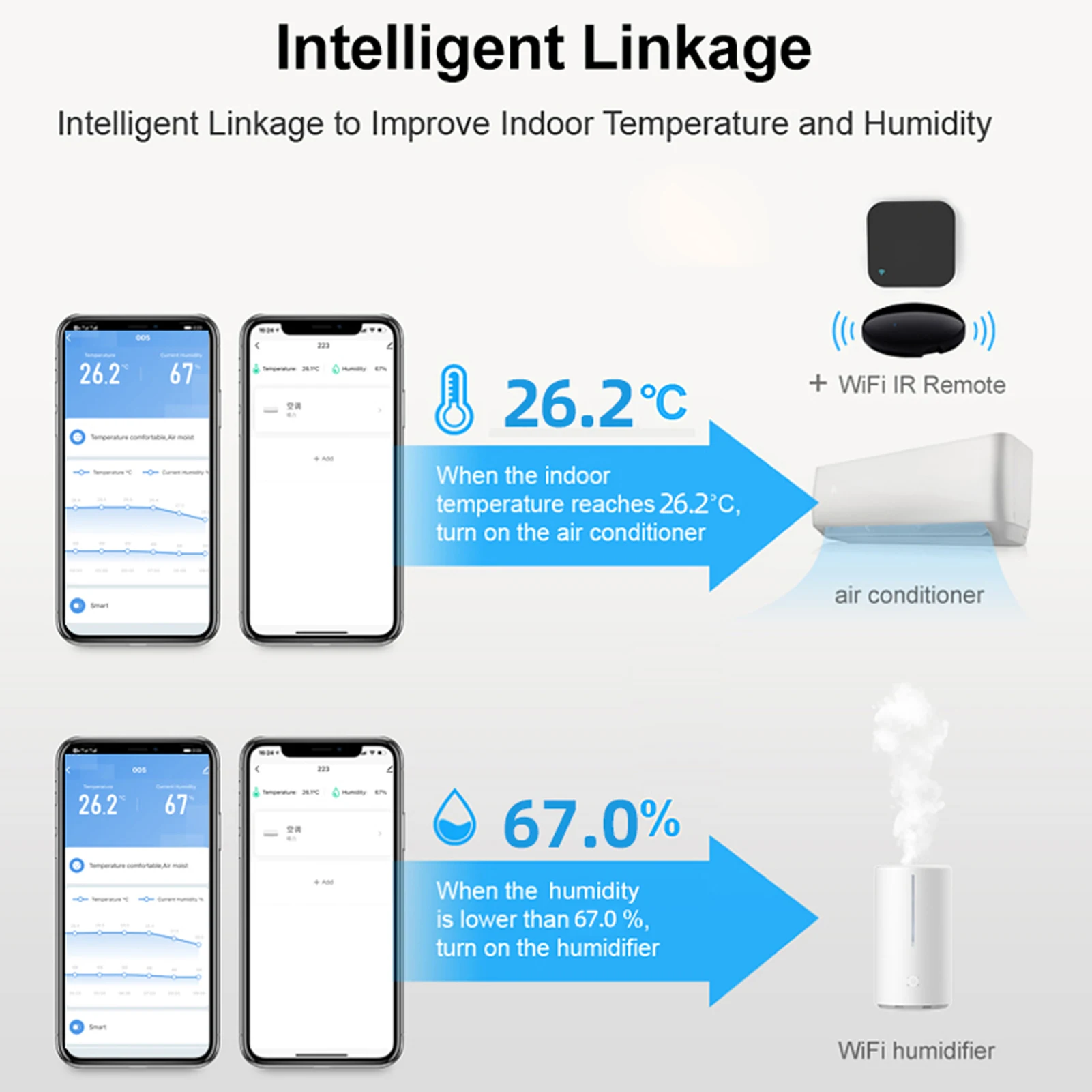 Интеллектуальная функция связи: с этой функцией вы можете достичь умной связи, например, когда температура в помещении достигает 26,2 ℃, включите кондиционер, когда Влажность ниже 67%, включите увлажнитель.