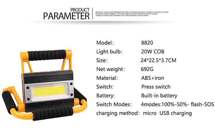 Модель: P-8820 Лампа: 20 Вт COB Размер продукта: 24*22,5*3,7 см Размер цветной коробки: 25*23*4,5 см Вес нетто: 692 г Вес брутто: 809 г Люмен: до 3000 лм (измерено) Материал: АБС + железо Переключатель: нажмите переключатель Аккумулятор: встроенный аккумулятор 5000 мАч Метод зарядки: Зарядка Micro USB, поддержка выходной мощности Уровень водонепроницаемости: IP44 Время зарядки: 6,5-7 часов Время разряда: Высший сорт: 2,5 часа, низкий сорт: 6 часов Шестерня: 4 передачи: 100% -50% -Flash-SOS Особенности: вращение на 360 °, складной, вход и выход, дисплей мощности. 【Широкое применение】:С помощью подставки вы можете поставить светильник на землю или повесить его за ручку. Идеально подходит для строительной площадки, строительной сантехники, мастерской, пристанища, гаража, чердака, токарного станка, деревообработки, пескоструйной кабины, реконструкции дома или ванной комнаты. Примечание: Пакет C использует батареи 4AA и не может заряжаться.