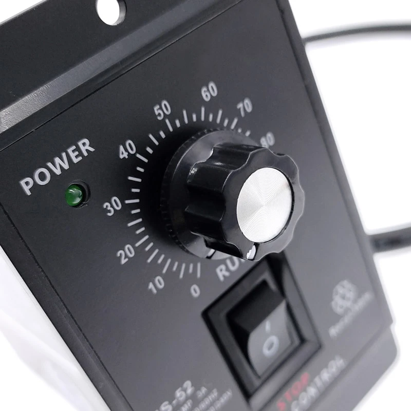 Green LED indicator, 6 terminals, on/ off switch for controlling, the knob switch for adjust the speed.Used for Machine Tools, Textile Machinery, Conveying Machine, Printing Mechanism,Food Machinery, Vending Machine, Packing Machinery, Gumming Machine, etc. It is not suitable for US users.