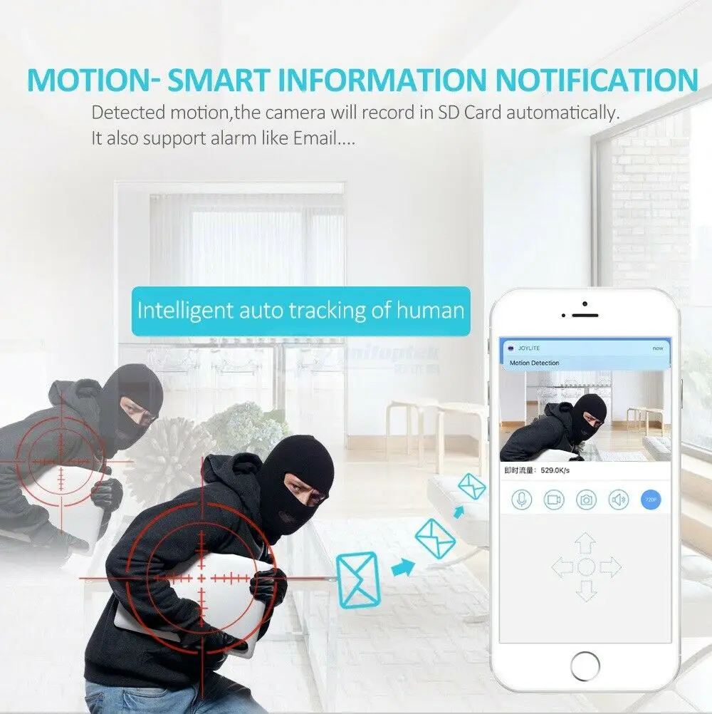 Головка камеры вращается с поворотом на 355 ° и наклоном на 90 °. Вы можете управлять им через приложение и получать широкий обзор на каждом дюйме вашего дома. Никаких деталей никогда не пройдет, даже если они попробуют.