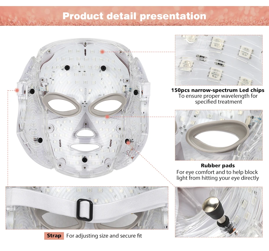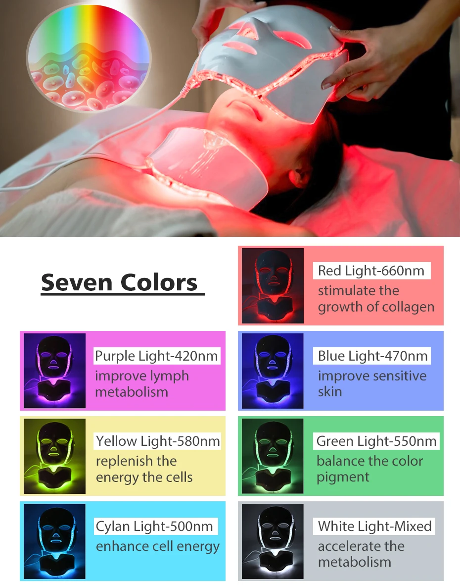 Красный светильник: Отбеливающее бледное пятно, нежная кожа и против морщин, восстанавливает поврежденную кожу, разглаживает мелкие морщинки, сокращает поры, гиперплазию коллагена. Синий светильник: эффективно минимизирует и лечит акне, восстанавливает кожу, оставляя шрамы Фиолетовый светильник: это красный и синий двухполосный светильник, сочетание двух видов эффекта фототерапии, особенно при заживлении и ремонте шрамов от акне Лазерный светильник (белый светильник): разрешение возрастных пятен, улучшение тонких линий и провисание кожи. Зеленый светильник: нейтрализация, баланс состояния кожи, снятие умственного стресса и эффективное дренажное лимфомирование и отек Желтый светильник: улучшает грубую кожу и морщины, покраснение, жар, кожный червь, повышает иммунитет Зеленый синий светильник: увеличивает энергию клеток постепенно, способствует метаболизму