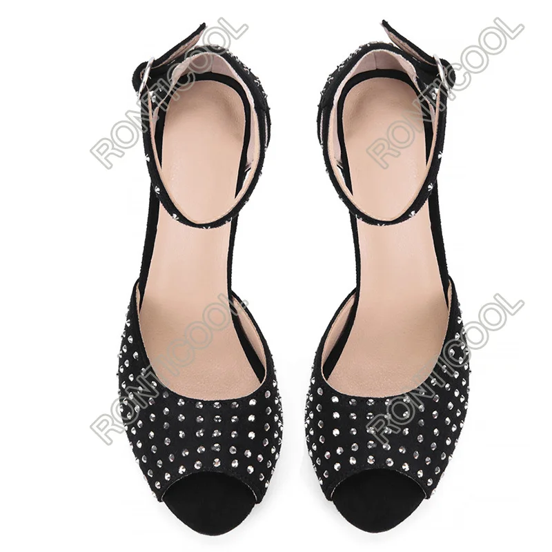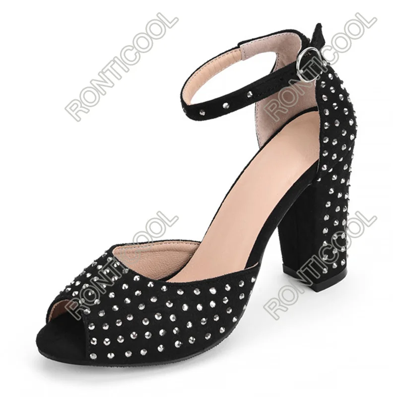 Ronticool/женские летние босоножки ручной работы; Замшевые туфли с ремешком на щиколотке на блочном каблуке; Элегантные черные модельные туфли с открытым носком; Размеры США 5-15