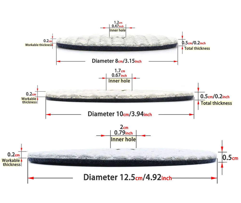 Это изделие самоклеящееся на обруче и петле сзади. Подходит для влажной полировки, фаски линии, дуговой пластины и специальной обработки камня. Он используется для обработки, ремонта и ремонта гранита, мрамора, бетона, цементного пола, терраццо, стеклянной керамики, искусственного камня, плитки, глазурованной плитки, витрифицированной плитки.