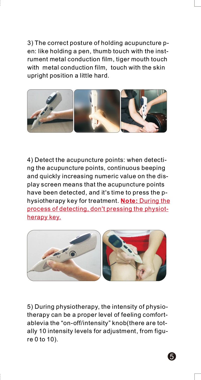 1. Не подходит для беременных женщин и пациентов с гипертонией. 2. Чтобы найти точки, во время обнаружения точки меридиана не нажимайте кнопку лечения. 3. Продукт поставляется с пустой баночкой геля, если ваша кожа сухая, используйте гель, проводящую жидкость, крем или косметический лосьон на частях тела, прежде чем использовать для обнаружения более точных акупунктурных точек. 4. Акупунктурная ручка не работает при зарядке. Пожалуйста, отключите и повторно Используйте устройство после его полной зарядки. Пример эффекта продукта.