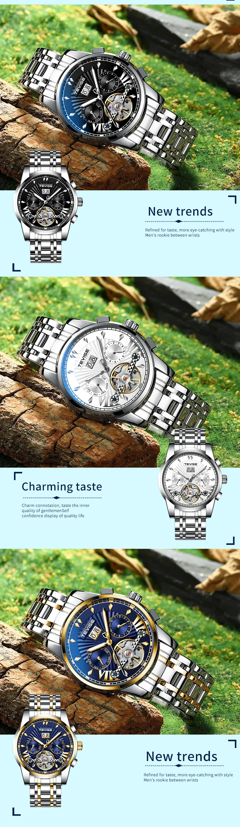 Мужские часы Tevise 9005, светящиеся механические часы с Лунной фазой, автоматический дисплей даты недели, наручные часы, часы Relogio Masculino