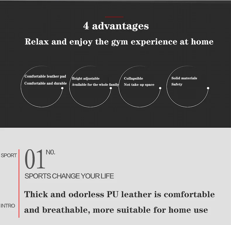 1. Толстая и без запаха из искусственной кожи удобная и дышащая, больше подходит для домашнего использования 2. Коврик гуманизирован, двухсторонняя регулировка, и высота коврика регулируется в 8 уровнях 3. Легко складывается, не занимает места Расширенная и утолщенная основная рама 4,50x50 мм Фитнес безопасен