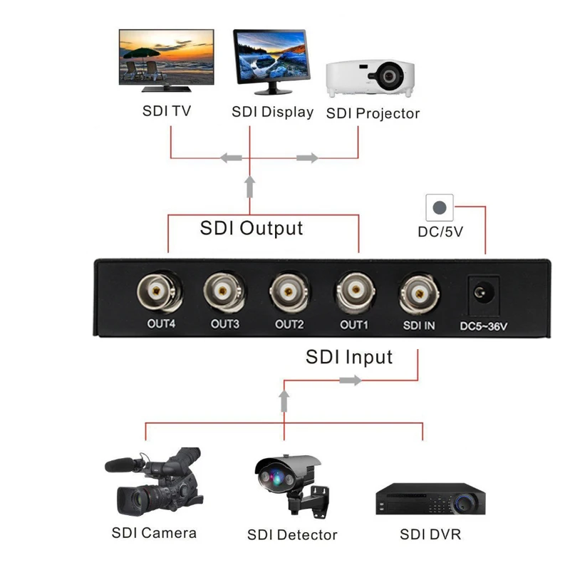 1x 4 3G/HD/SD SDI сплиттер-это специальный разветвитель сигналов 3G/HD/SD SDI, интегрирует FRCS (система преобразования кадров), SDI приемники и SDI кодер, можно преобразовать сигналы 3G/HD/SD SDI в различные разрешения видеосигналов 3G/HD/SD SDI.