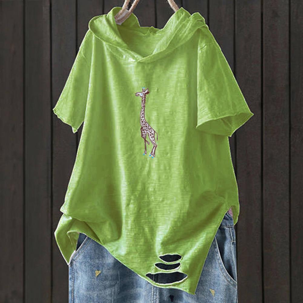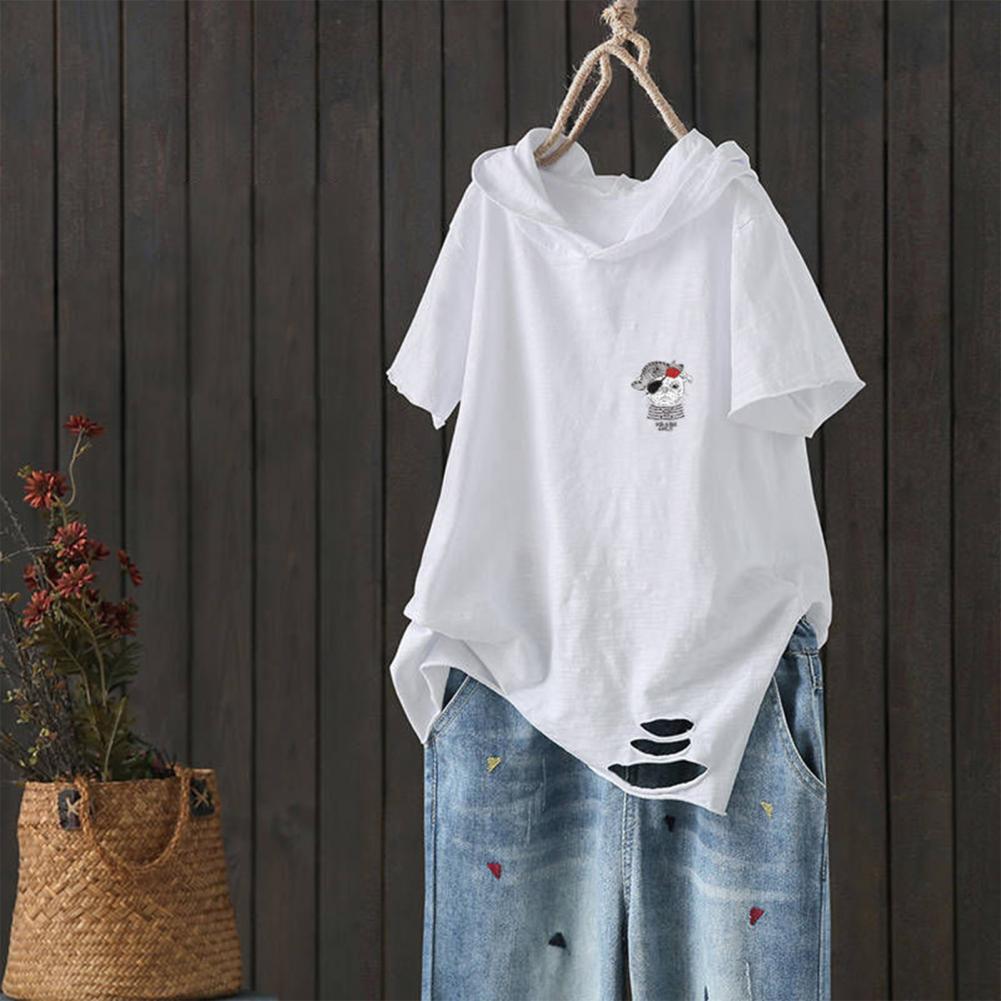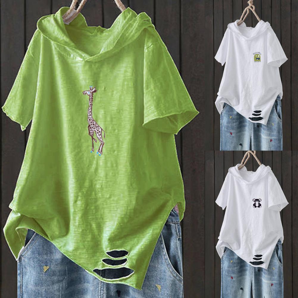Рисунок с принтом выглядит мило и интересно. Повседневная Свободная футболка с рваными дырками и капюшоном.