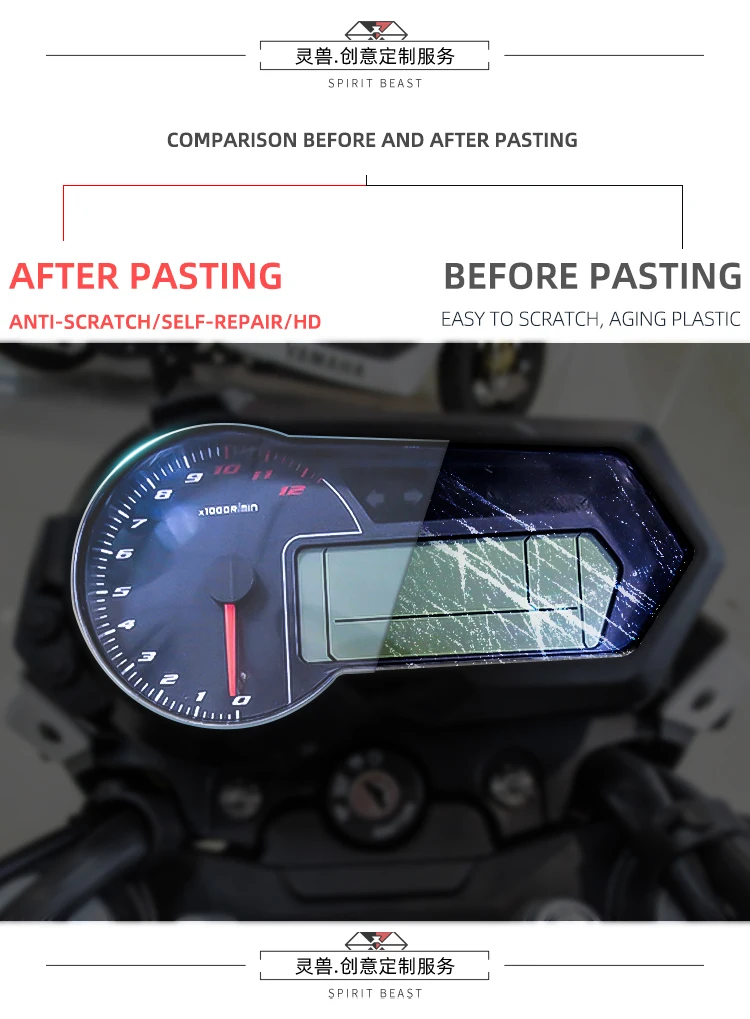 Бренд продукта: SPIRIT BEAST Название продукта: YBM012-instrument пленка L12 Материал изделия: ТПУ Цвет изделия: Прозрачный Функция продукта: высокая четкость, высокая прозрачность, устойчивость к царапинам, защита от тумана и дождя Применимые модели: Benelli TNT 125/135 Количество товара: купите один бесплатно Характеристики продукта: защита от дождя и тумана/высокая прозрачность/HD/Защита от царапин/Защита от пыли Теплое напоминание; Отрывайте ① при наклеивании Используйте скребок/карту для удаления пузырьков, затем разорвите ②