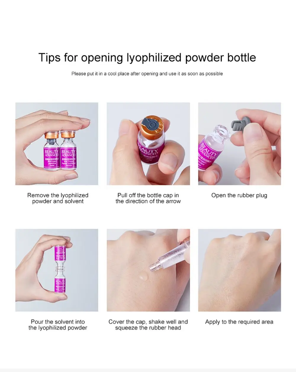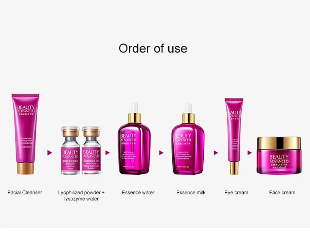 Используйте следующие шаги:Сначала очистите лицо с очищающее средство для лица, mix лиофилизированный питания + Лизоцим воды, применяются затем используйте эссенция воды, Суть молоко, затем используйте для ухода за областью вокруг глаз, и, наконец, использовать крем для лица.