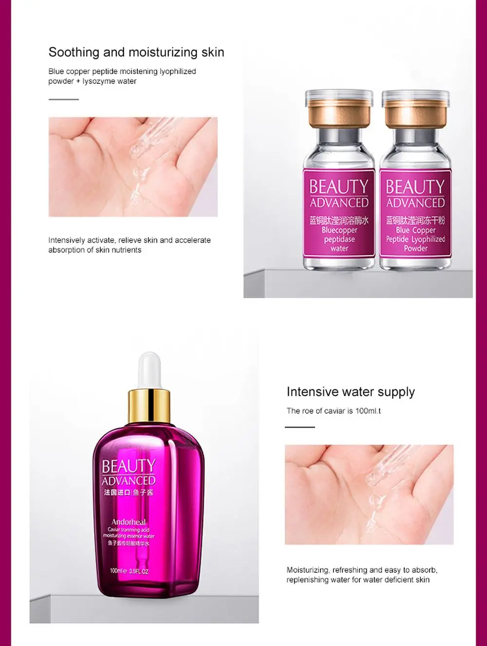 Название продукта:Моющее средство: 100G, эссенция воды: 100 мл, Суть молоко: 100 мл, эссенция, крем для лица: 50 г, эссенцию для ухода за областью вокруг глаз: 30 г. Маска для сна: 30 г, синий медь пептид лиофилизированный порошок: 25 мг * 5 синяя медная Peptidase решение: 3 мл * 5