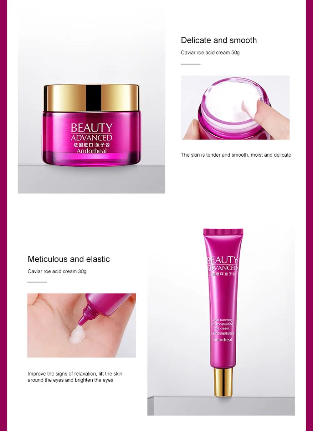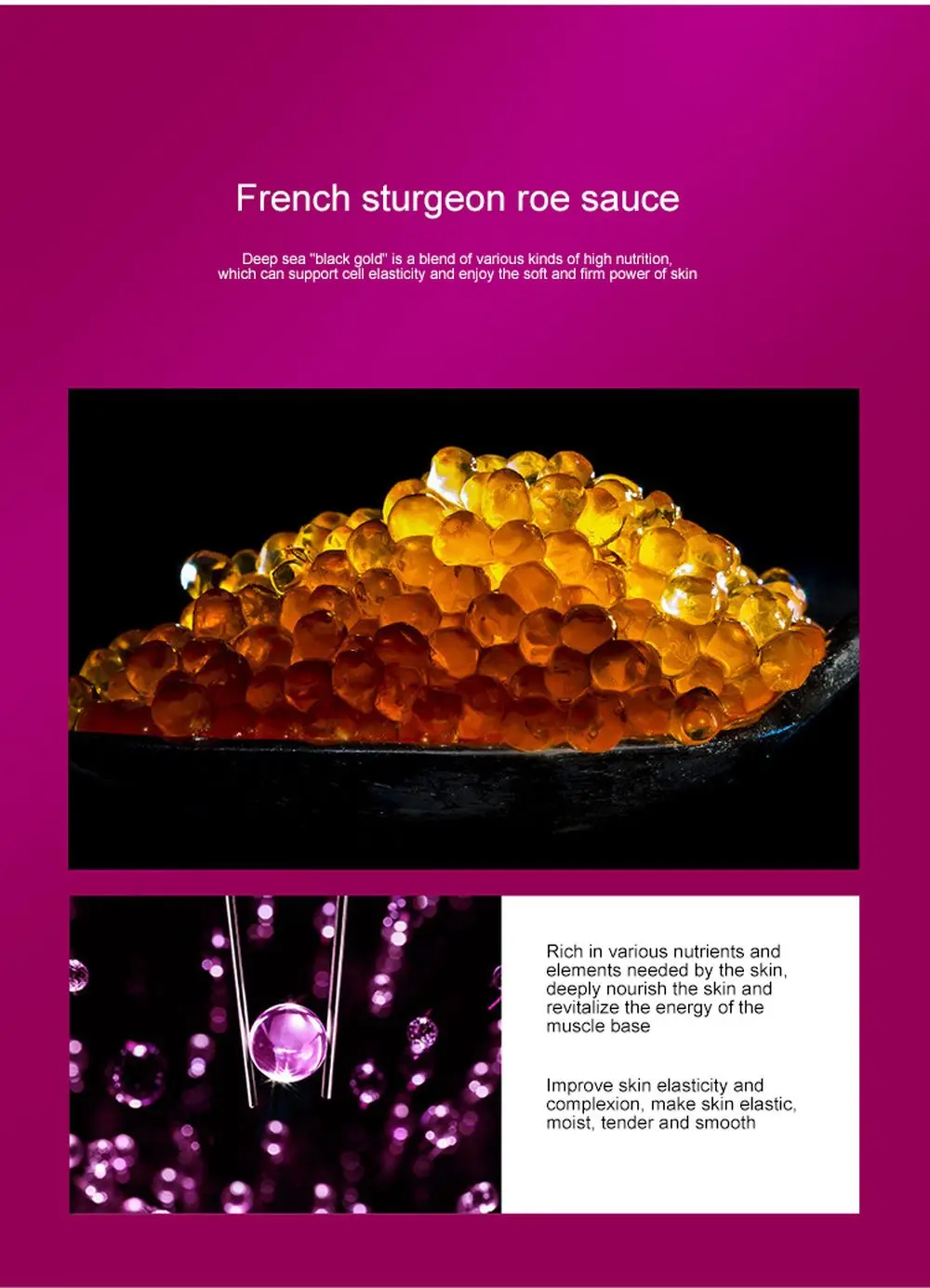 Эффективность продукта:Содержит французский импортированы Икра ингредиенты, нежная и гладкая водный сенсорный восстанавливает кожу; Отводят влагу и мягкий и нежный уход за телом, делая ее увлажненной и гладкой. Затянуть, с эластичной резинкой, и осветляет тон кожи.