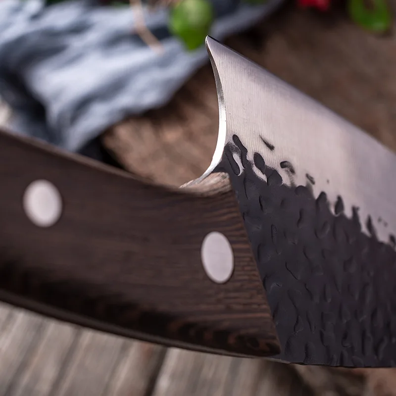 Материал лезвия: нержавеющая сталь 5Cr15mov Материал ручки: дерево с куриными крыльями + Медный гвоздь Натуральное куриное крыло Деревянная ручка из натуральных куриных крыльев славится своей уникальной текстурой и закрепляется высокотемпературным уплотняющим воском для улучшения цвета и долговечности. Волнистый дизайн ручки В соответствии с искусственным дизайном, ручка в форме волны используется для увеличения противоскольжения и комфорта. Медные заклепки Luban Craft. Прочный, прочный и устойчивый к коррозии. Процесс почернения слой Процесс чернения делает поверхность лезвия оксидным слоем для достижения антикоррозионного эффекта. Кованый узор молотка После высокотемпературной ковки улучшается плотность и чистота стали, благодаря чему значительно повышается твердость и прочность стали. Ручное водяное фрезерование Лезвие разглаживается вручную водой, лезвие гладкое, острое, устойчивое к порезам и легко шлифуемое.
