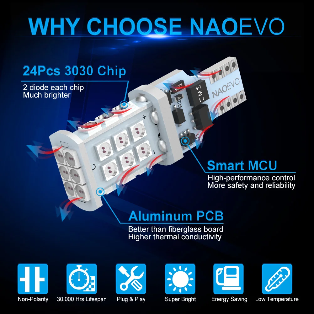 NAO 921 912 T15 стробоскопические светодиодные лампы будут стробоскопировать 3-4 раза ВКЛ и ВЫКЛ в начальный режим заднего хода или торможения для гораздо более легкого уведомления и безопасной остановки, А затем поверните Стабильный Прочный стоп-сигнал (в соответствии с правилами мигания), чтобы избежать столкновения заднего хода транспортного средства.