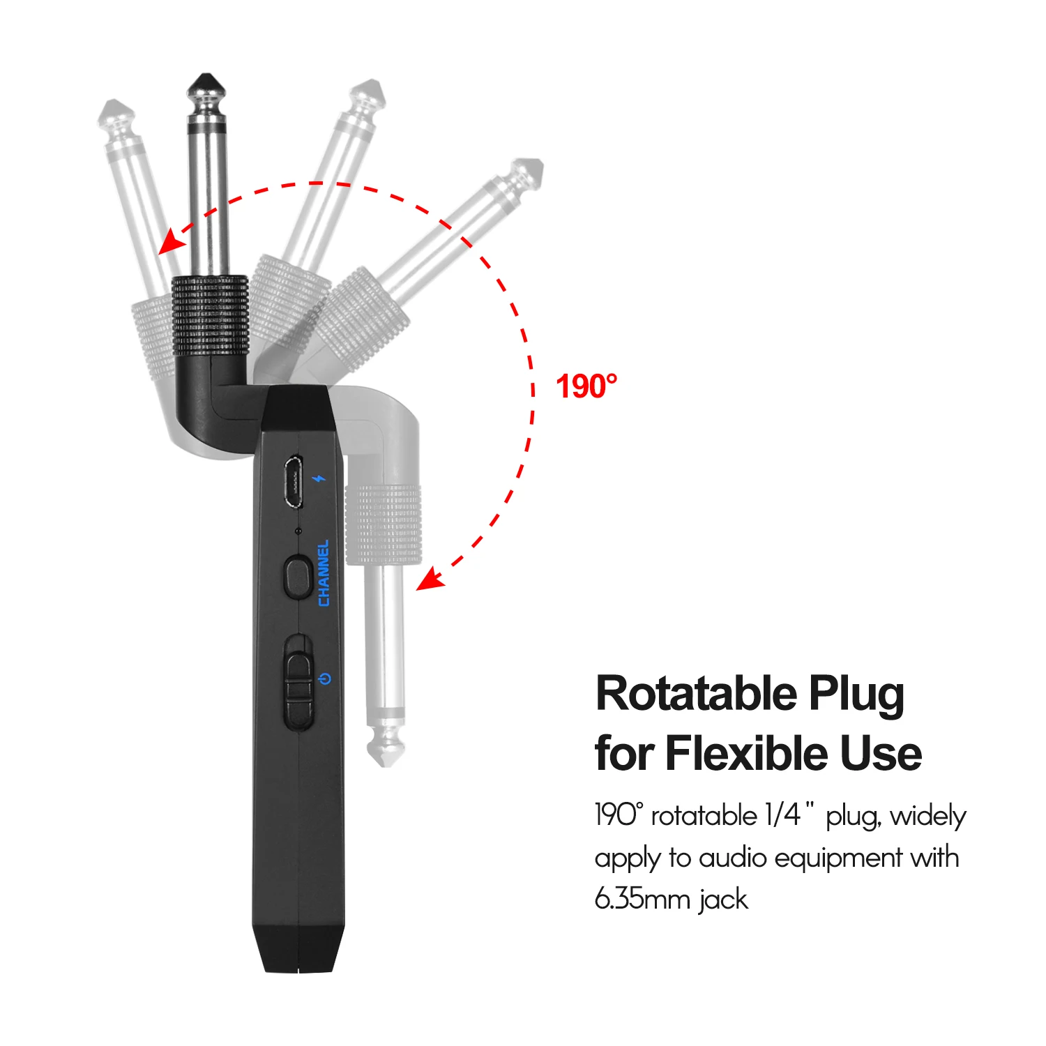 Подключи и работай, нет необходимости подключения кабеля, гибкий и удобный в использовании. Игрок может концентрироваться на своей производительности на сцене, концертах и тренировках без проблем с проводами. 210 ° вращающийся 1/4 "дизайн штепсельной вилки, доступен для инструментов с входным гнездом в различных положениях. Небольшой по размеру и весу светильник для портативности.