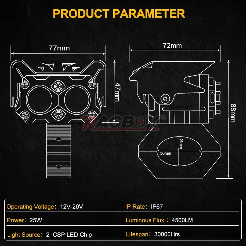 Подходит для различных условий: белый и желтый. Он имеет хороший эффект облучения в снежную, дождливую, туманную и пыльную погоду.