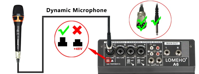 При использовании динамического микрофона, пожалуйста, не включайте phantom + 48 В, иначе динамический микрофон может быть сгорел.