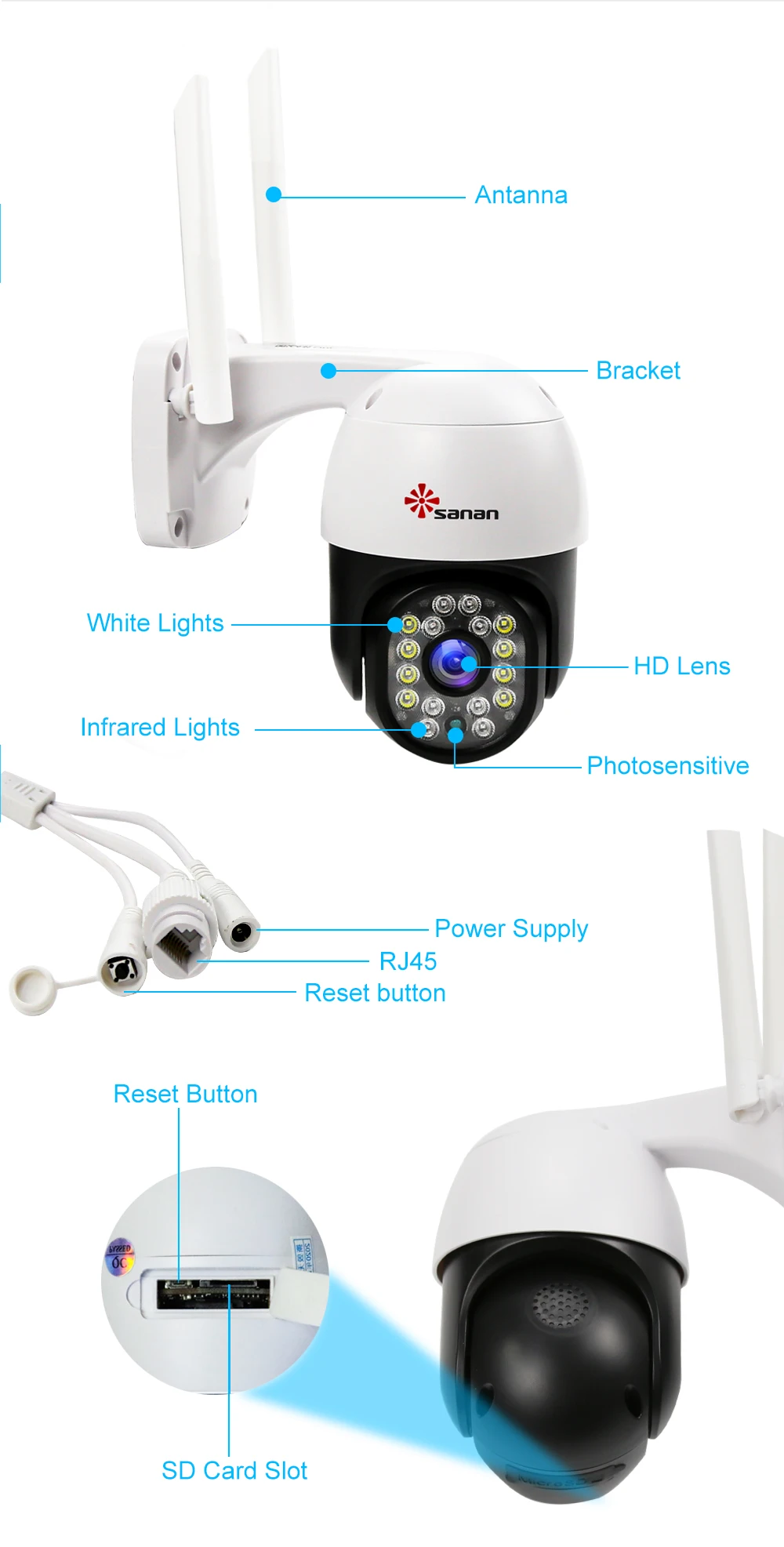 Со встроенными 8 инфракрасными светодиодами и 8 белыми светодиодами, они могут видеть до 30 м в полной темноте и снимать изображения в ярком цвете даже ночью. Режимы ночного видения можно переключать на ИК Ночное Видение, полноцветное ночное видение и умное ночное видение.