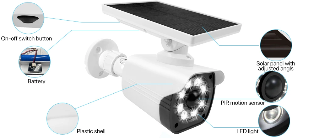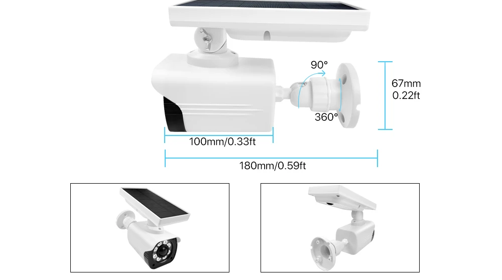 This is a solar fake camera, with eight LED lights, which is easy to install and looks like a real camera. It's hard for a villain / thief to distinguish it from a real CCTV camera.