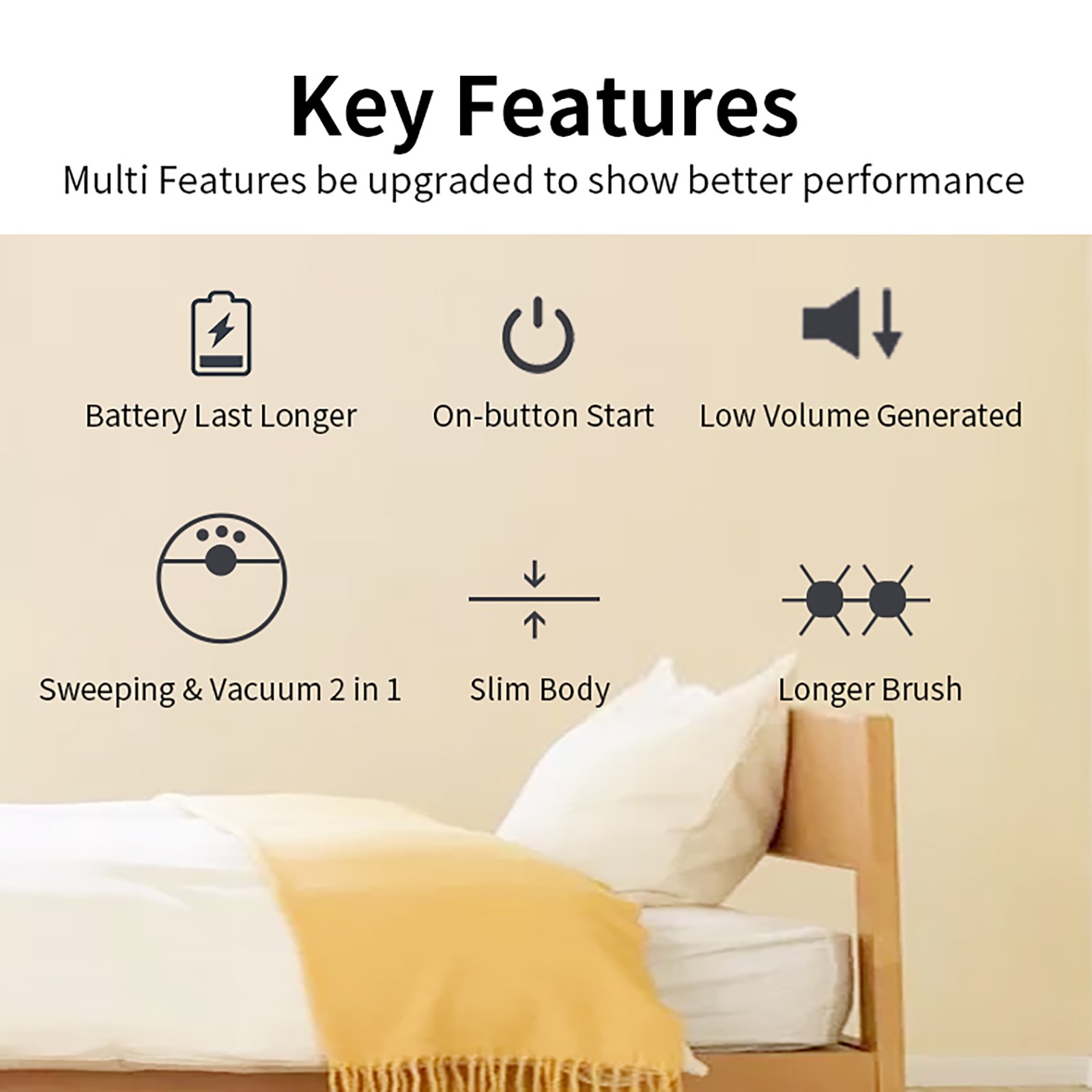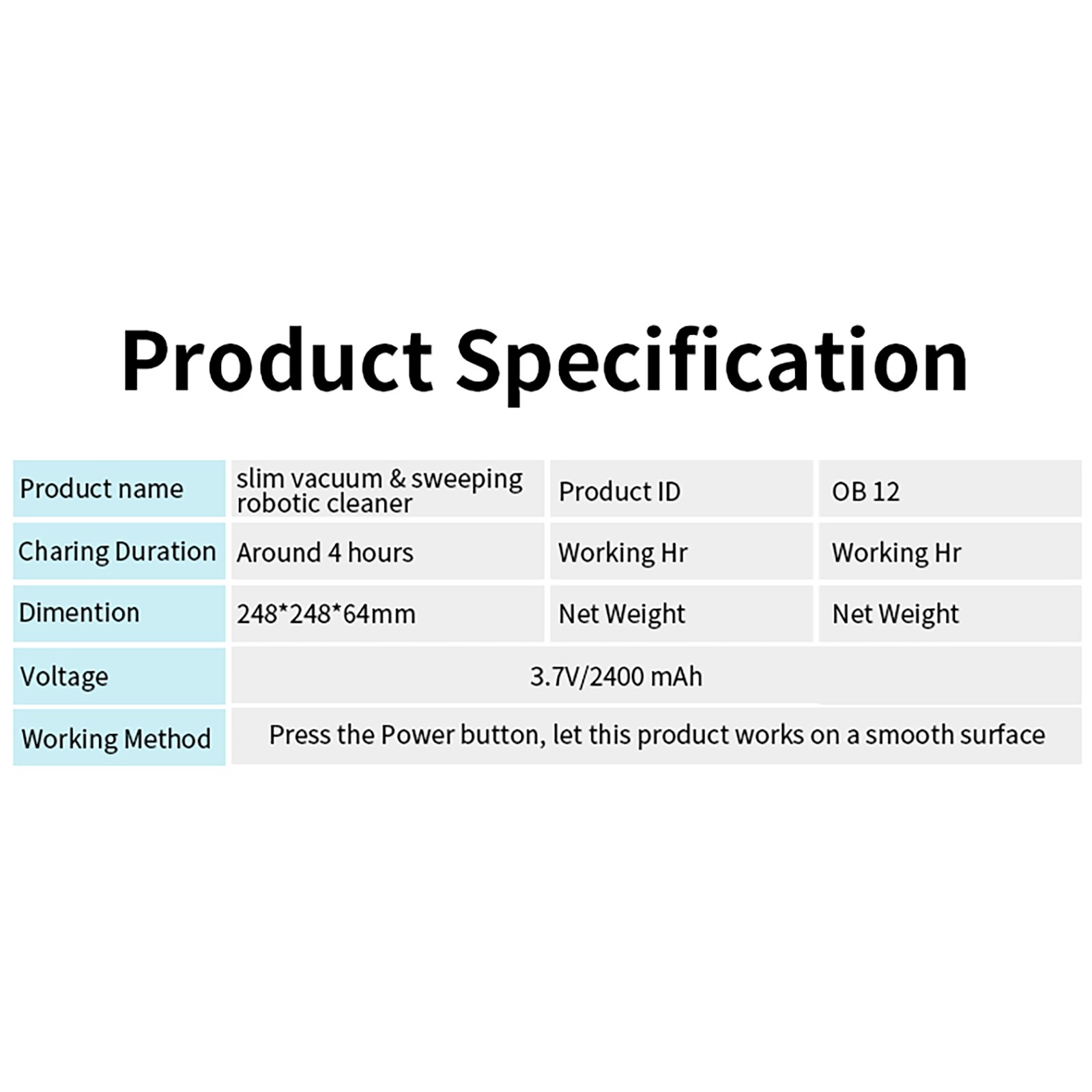 Размер изделия: 24,8*24,8*6,4 см Размер цветной коробки: 27,6x26,7x7,5 см Корпус литиевая батарея: 3,7 V 2400MAH Время работы: около 70 минут Время зарядки: около 4 часов Площадь уборки: 150 ㎡ Мощность всасывания: 1200PA Рабочее напряжение: 3,7 V Номинальная мощность: 6 Вт Шум: <60 дБ Вес изделия: 560 грамм Вес с цветной коробкой: 850 грамм Очистка мусора: сажа, раковины семян дыни, закуска мусора, песка, волос, щепы и т. Д. Цвет: бежевая текстура, элегантный черный Применимый Пол: плоский пол, такой как мрамор, керамическая плитка, деревянный пол и т. д.