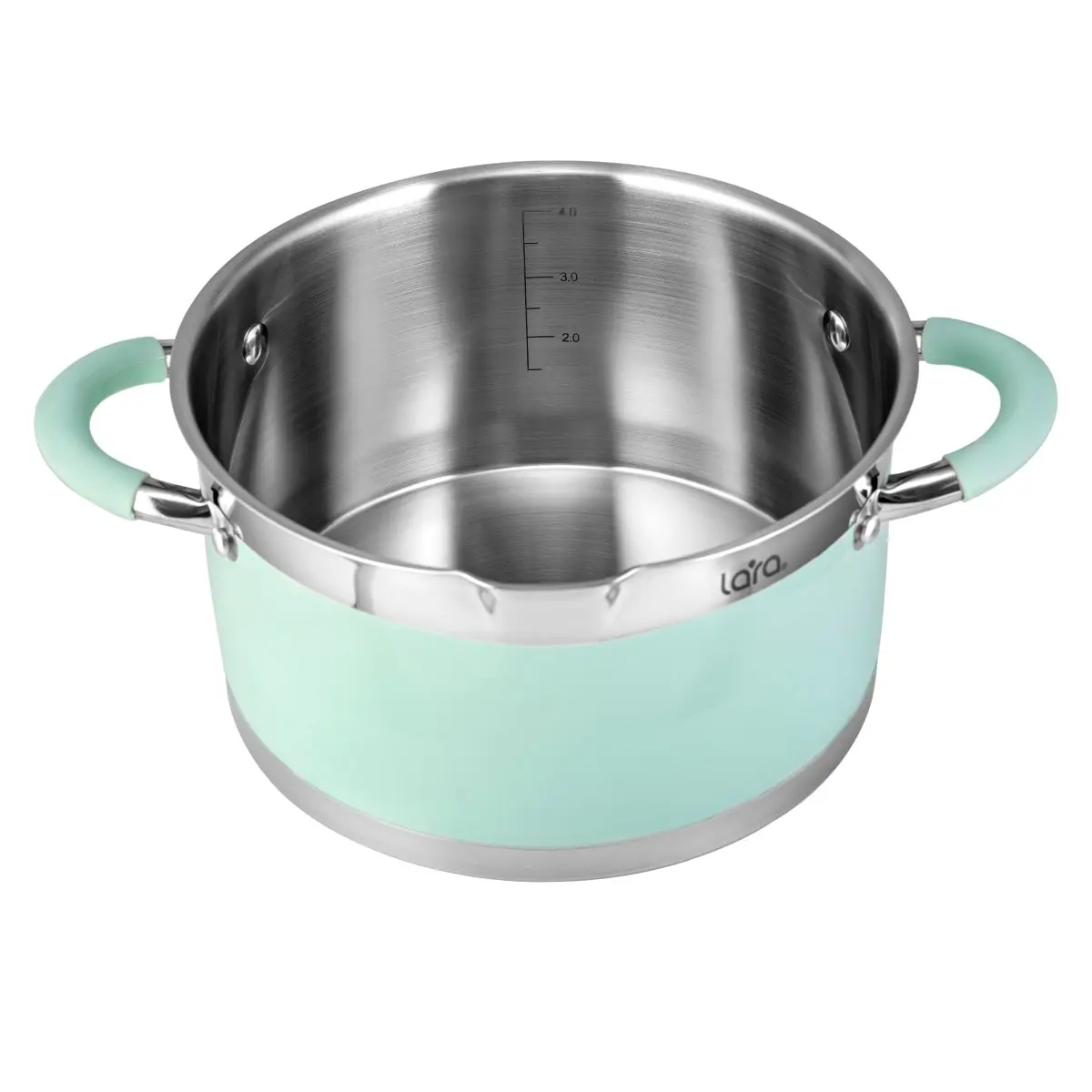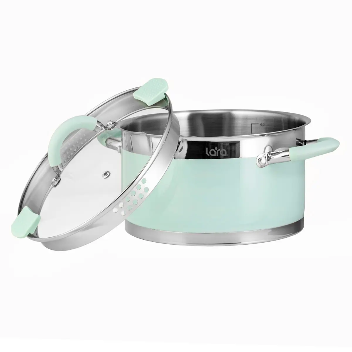 Если не знаете как освежить интерьер своей кухни, кастрюли LARA серии "MINT" помогут в этом. Они дополнят любую кухну и непременно добавят лёгкости и свежести. Оригинальный дизайн прямой формы с комбинированной полировкой и отделкой мятного цвета не оставит равнодушной ни одну хозяйку. Для кастрюли мы применили высококачественную нержавеющую сталь SS201, термостойкое стекло для крышки и ненагревающийся силикон на ручках. Одной из главных особенностей серии является уникальная конструкция крышки с отверстиями Ø3 Ø6 мм, позволяющей быстро и без труда слить излишнюю воду. Стальное индукционное капсулированное дно подходит для всех типов плит.