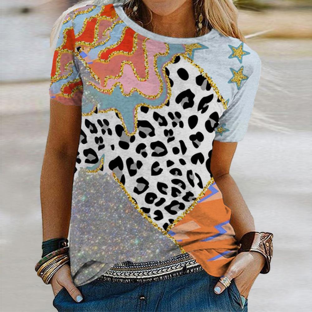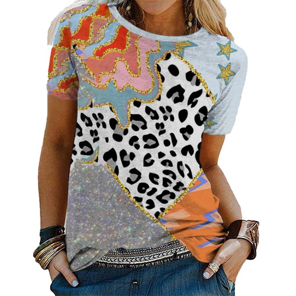 Дизайн с цветными блоками и леопардовым принтом делает эту футболку очень стильной и сексуальной.
