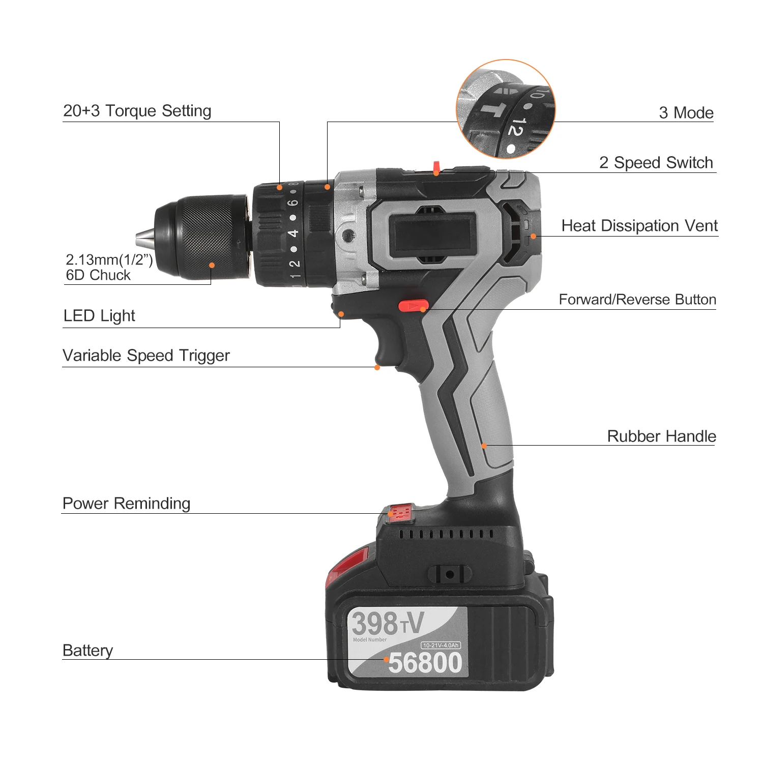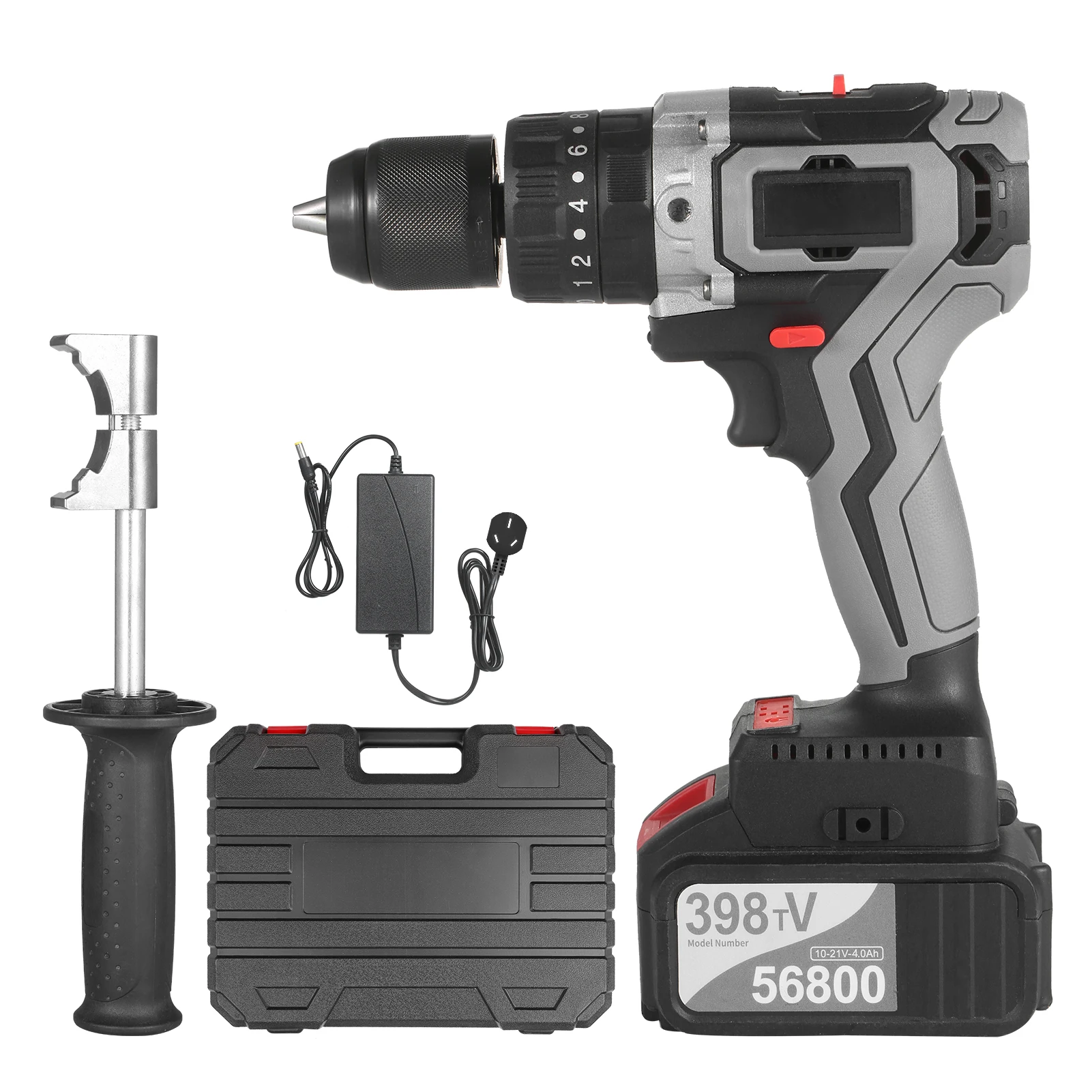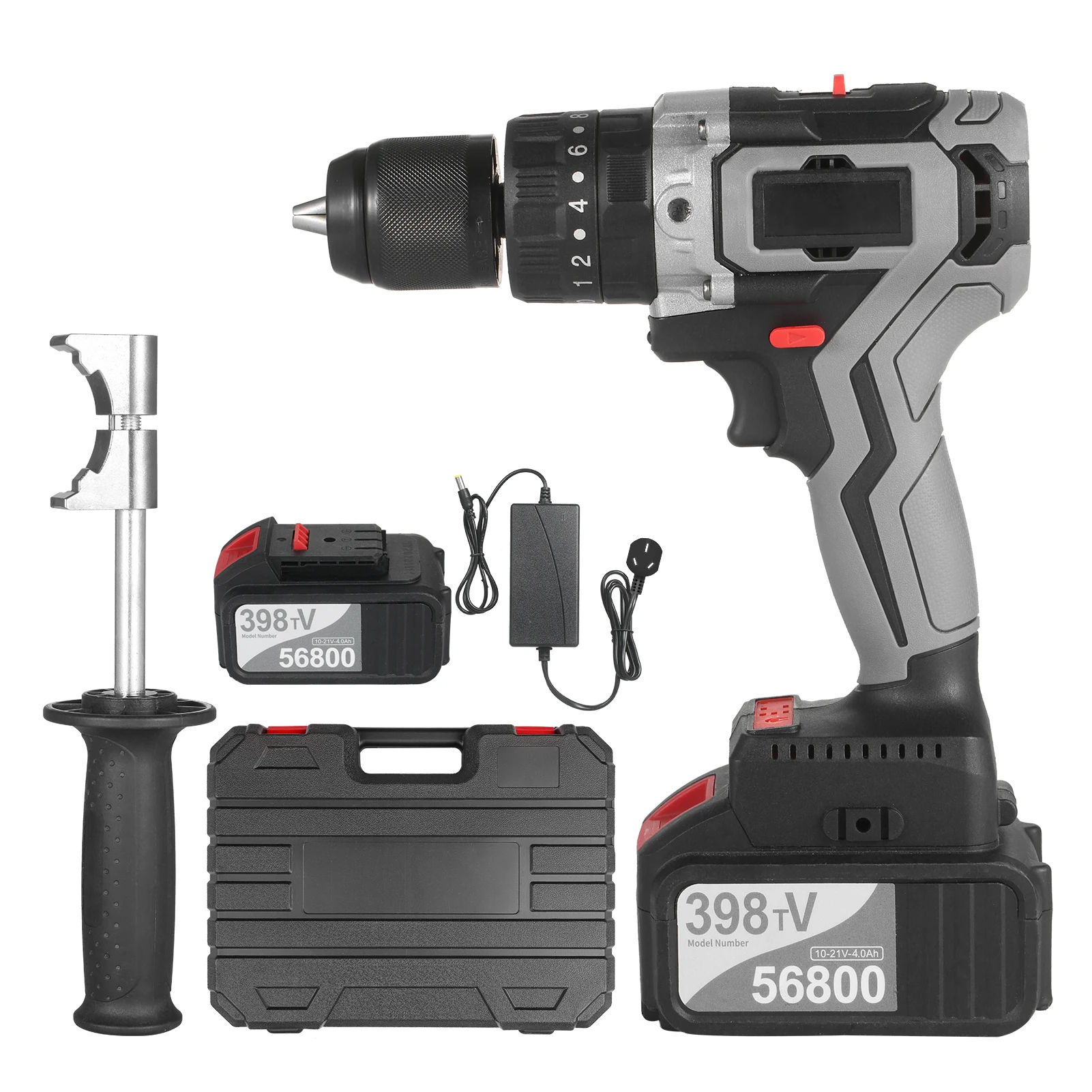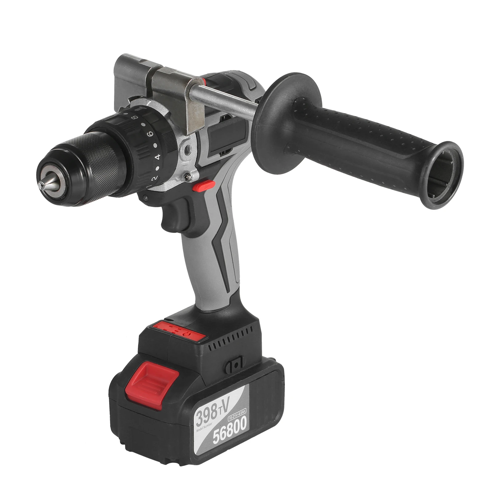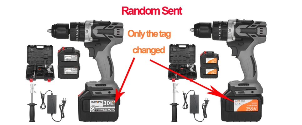 21V 6.0A Максимальная батарея-1 упаковка/2 комплекта опционально. Литиевая батарея большой емкости 21V max 6000mAh достаточно мощна, чтобы держать дрель постоянно работает в течение 10 часов, когда не загружается. Индикатор на передней части ударной дрели отображает, сколько энергии осталось для меньшего времени простоя на работе.