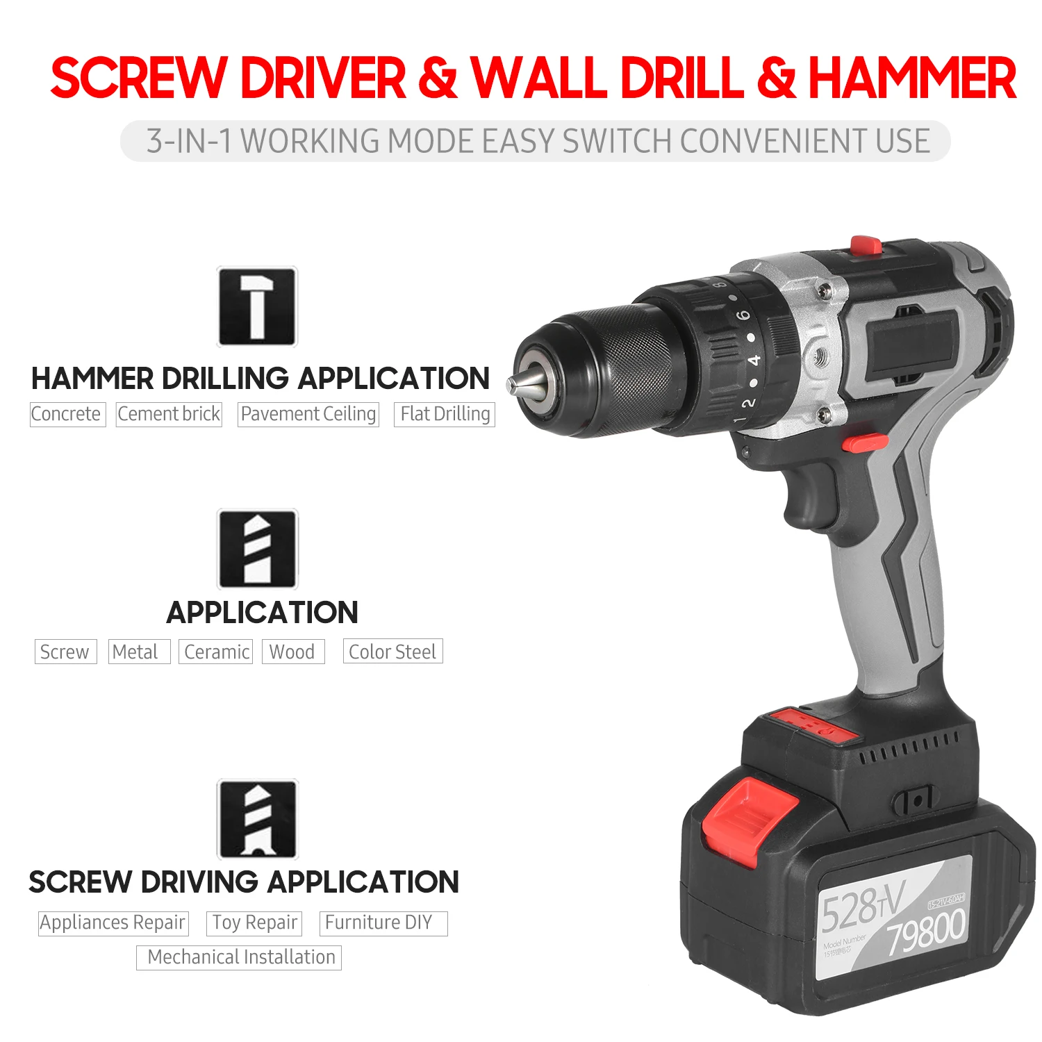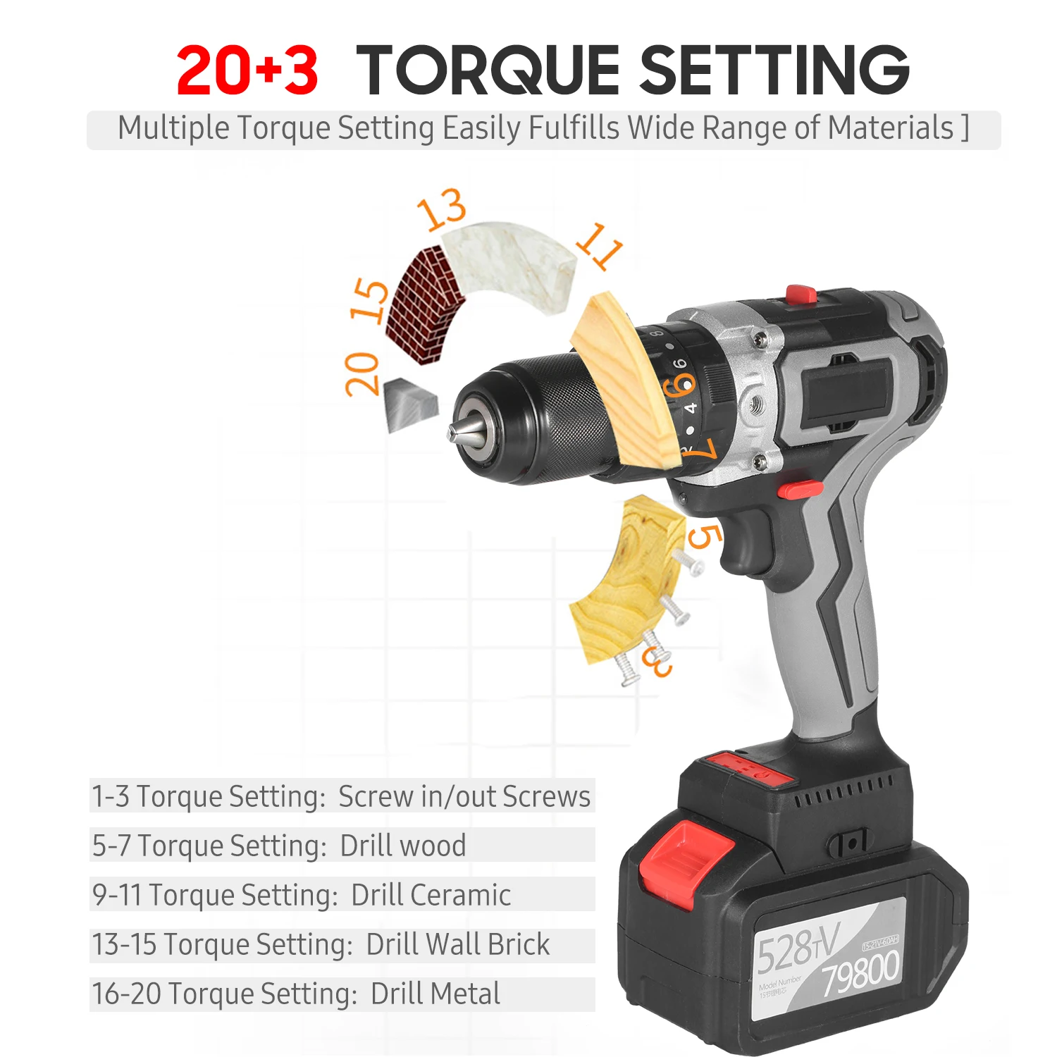 23 положения сцепления и 2 переменной скорости-20 + 1 + 1 + 1 настройки крутящего момента, 2 скорости s(0-450 об/мин/0-1550 об/мин) регулировка, переменный триггер скорости и переключатель вперед/назад обеспечивают благоприятную силу и точное управление для вождения/выхода винтов для предотвращения зачистки и сверления в древесину, пластмассы, лед, металл и цветную сталь с легкостью. Низкий крутящий момент с первой скоростью для винтов вождения и сверления древесины. Высокий крутящий момент со второй скоростью для бурения стен и функций молотка.