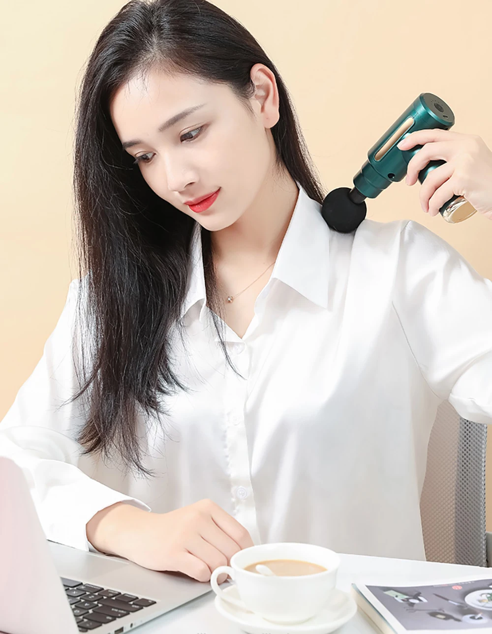 Облегчение всего тела и релаксация-Универсальный пистолет оснащен 6 регулируемыми скоростями/частотой и 4 сменными резиновыми массажными наконечниками для определения точек давления на шее, спине, голени, ногах, плечах, бедрах и т. д.