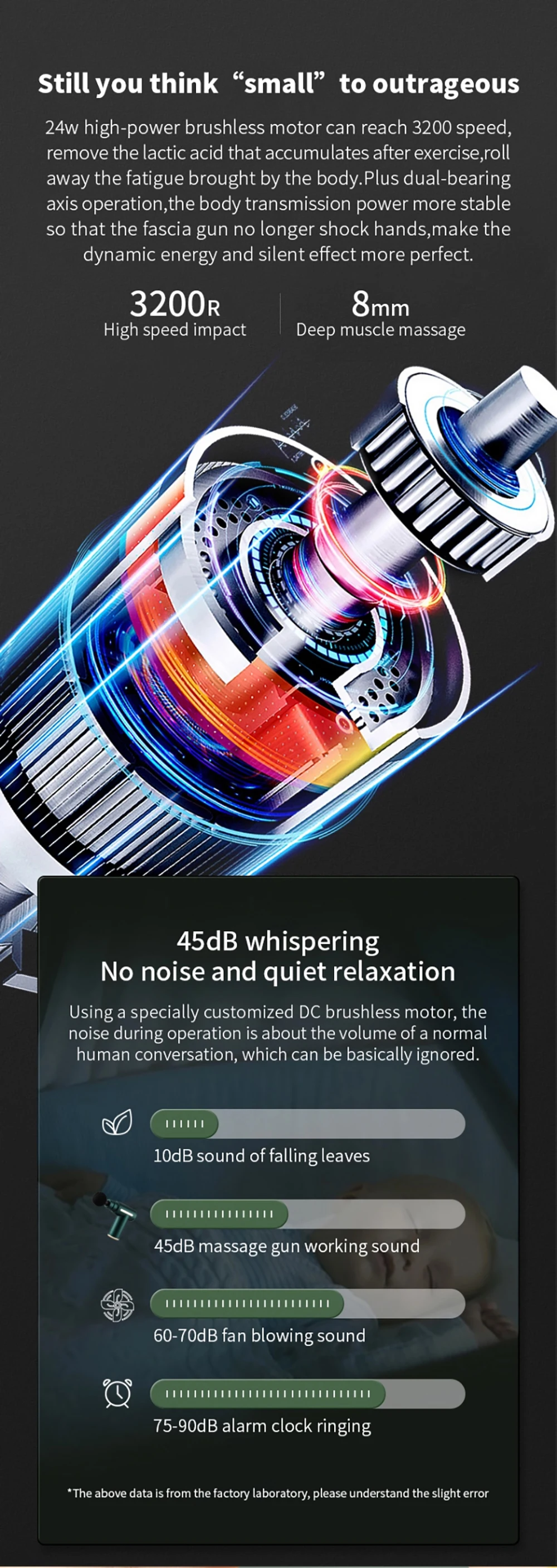 Супер тихая двигательная технология-в отличие от более ранних ударных инструментов, наш обеспечивает такой же мощный комфорт и облегчение, не отвлекающий шум; Идеально подходит для мужчин и женщин, мужчин, спортсменов, бодибилдеров, бегунов, пловцов и тяжелых атлетов.