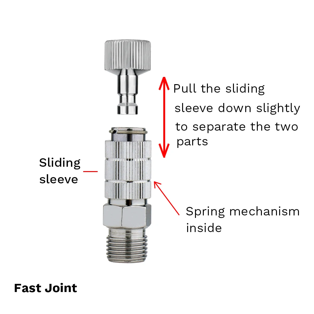 Быстрое соединение (Airbrush quick realease): одна сторона соединяется с airbrush, а другая сторона подключается к шлангу. Этот аксессуар можно быстро разделить на две части, избегайте утомительной работы при запуске/остановке работы. Экономьте время для вас и сделайте проект более легким.