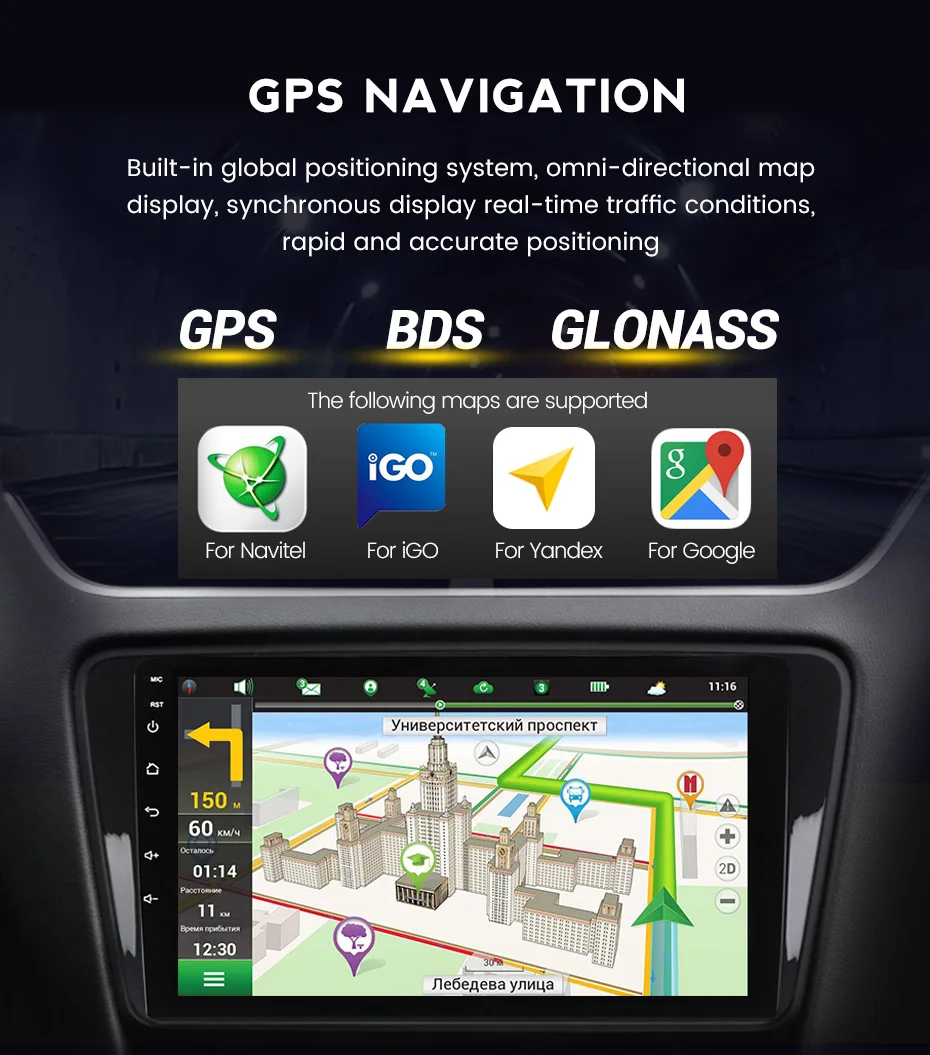 > Встроенная Глобальная система позиционирования, всенаправленный дисплей карты, синхронный дисплей условий движения в реальном времени, быстрое и точное позиционирование.