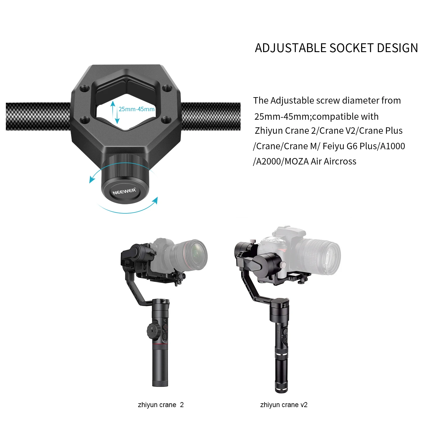 Совместим с Zhiyun Crane 2, Crane V2, Crane Plus, Crane, Crane M, Feiyu G6 Plus,A1000, A2000, MOZA Air Aircross и другими камерами диаметром в пределах 25-45 мм.