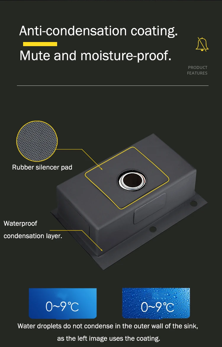 Сверхплотная РезинаЗвукопоглощающие подушечки покрывают 80% основания раковины для поглощения шума и вибрации.