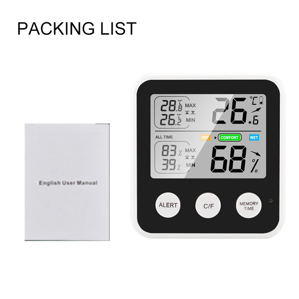 С большим ЖК-экраном, этот простой в эксплуатации гигротермограф может использоваться для обнаружения значений температуры и влажности в реальном времени/24 часа. Кроме того, он может отображать напоминание о комфорте в зависимости от влажности в реальном времени.