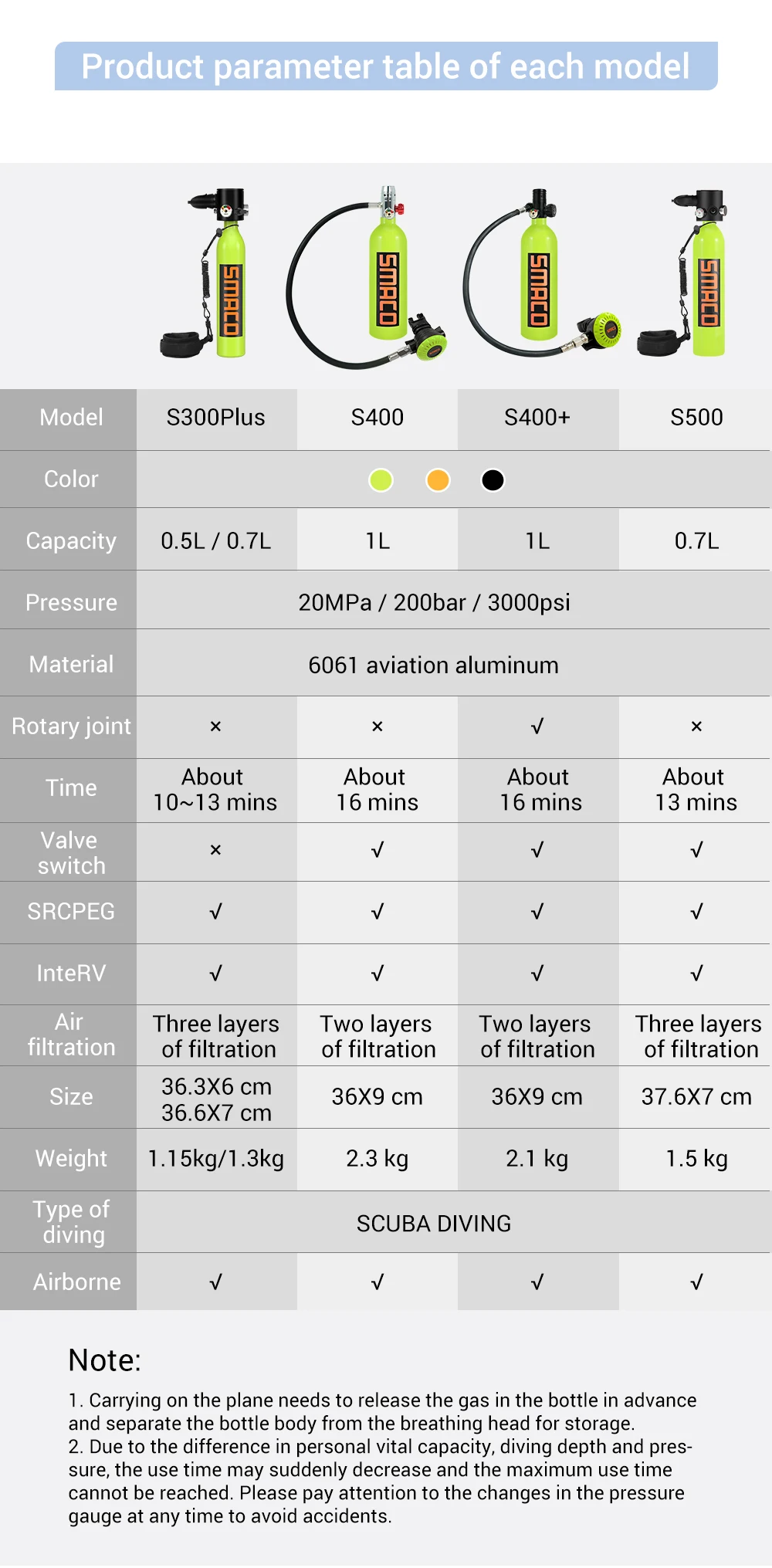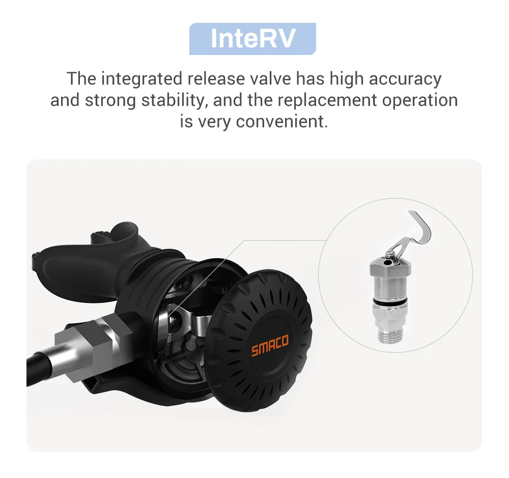 Снаряжение для дайвинга SMACO S400 оснащено устройством для выхода воздуха под постоянным давлением, что обеспечивает постоянное давление на выходе, что делает дыхание очень легким. В то же время принимается конструкция внешнего взрывозащищенного клапана, что делает взрывозащищенный индекс более точным и безопасным в использовании.