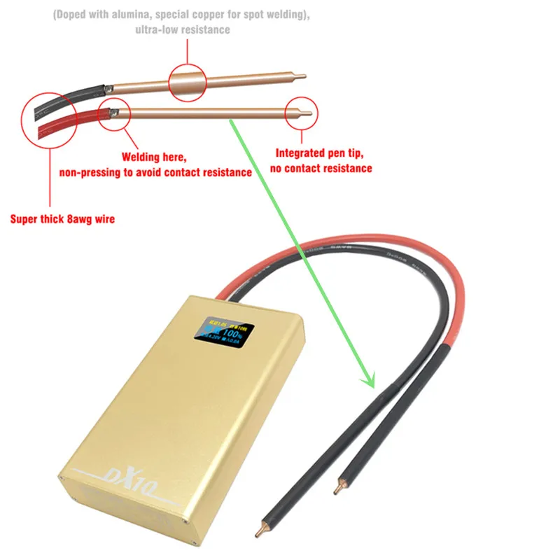 Ручка для точечной сварки принимает штепсельную вилку ec5, провод 30 см 8awg, диаметр 6 мм, твердый алюминиевый оксид, медный стержень длиной 10 см, полная Сварка без прессования, более низкое внутреннее сопротивление, чем другие ручные точечные сварщики на рынке, поэтому он поддерживает более высокую силу тока и плотную никелевую полосу точечной сварки;