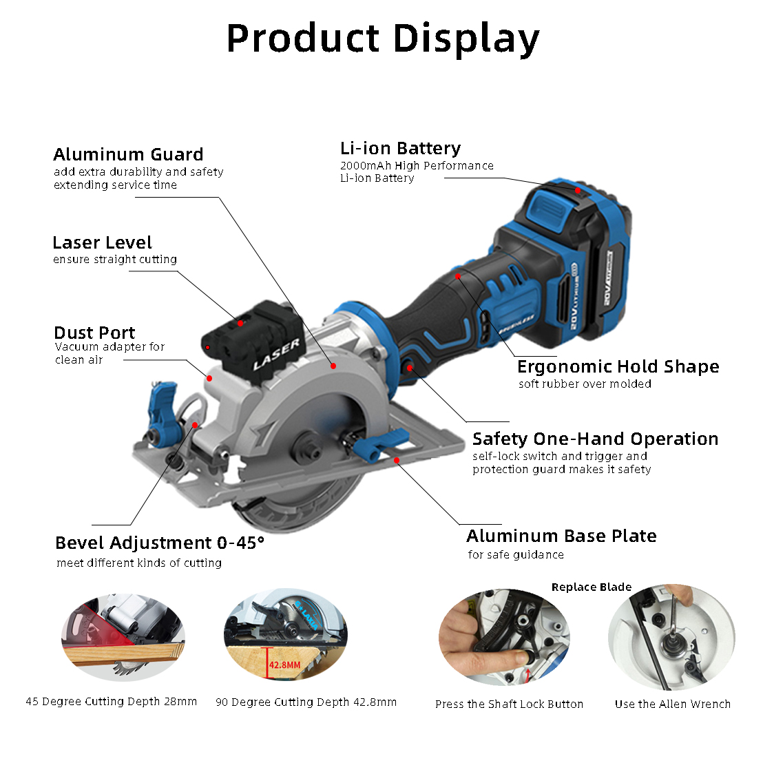 · Глубина резки: 42,8 мм (90 градусов), 28 мм (45 градусов)