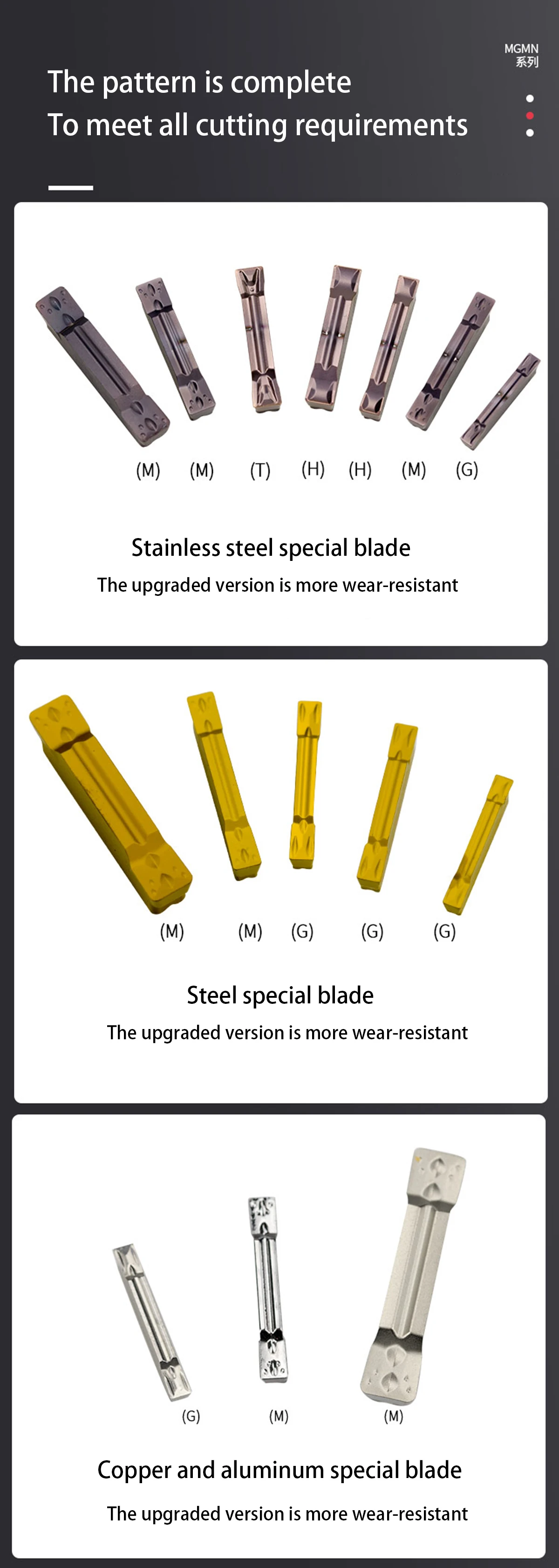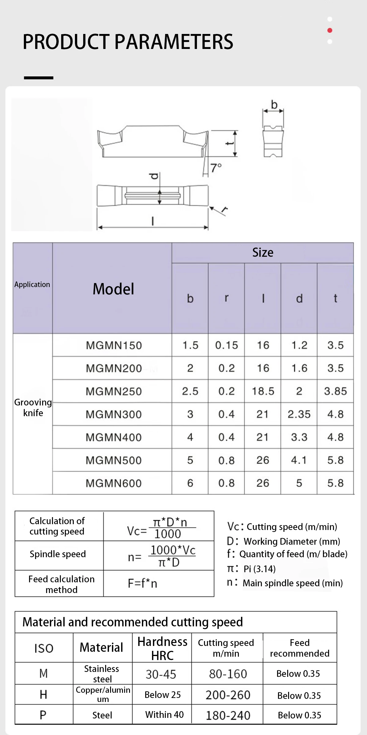 Диапазон обработки: материал ПК подходит для обработки нержавеющей стали, материал NC подходит для обработки стальных деталей, а материал MO подходит для обработки алюминиевых деталей