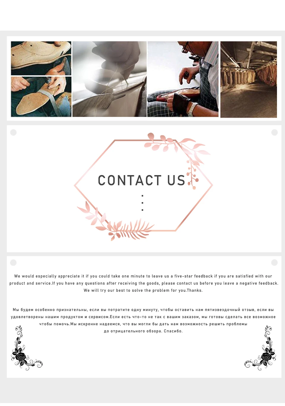 3) Пожалуйста, свяжитесь с нами, прежде чем оставить нейтральный (3 звезды) или отрицательный (1-2 звезды) отзывы. Мы постараемся сделать все возможное, чтобы решить проблему и подарить вам приятную атмосферу покупок здесь. Большое спасибо!