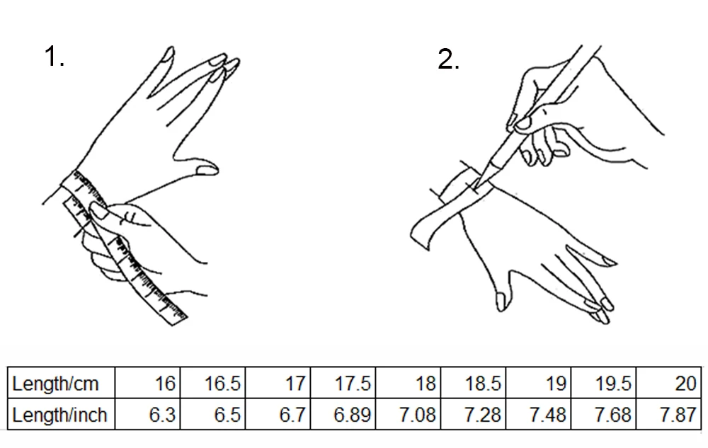 1) Используйте ленту для измерения вокруг запястья. Длина ленты-это длина запястья.