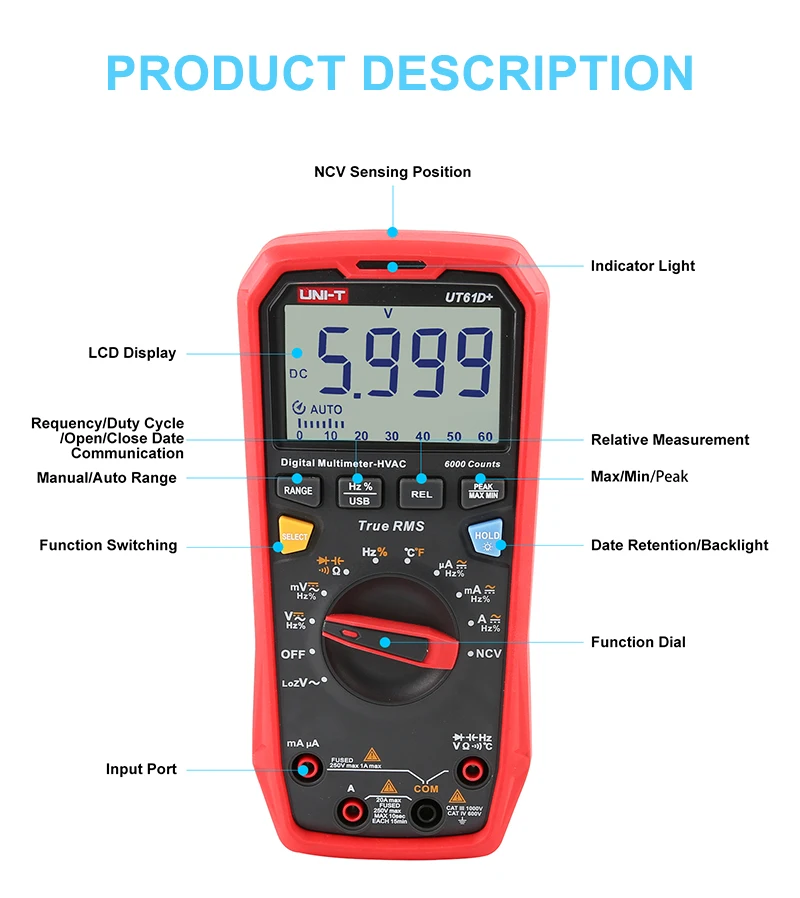 UNI-T UT61B + цифровой мультиметр True RMS AC/DC тестер сопротивления тока