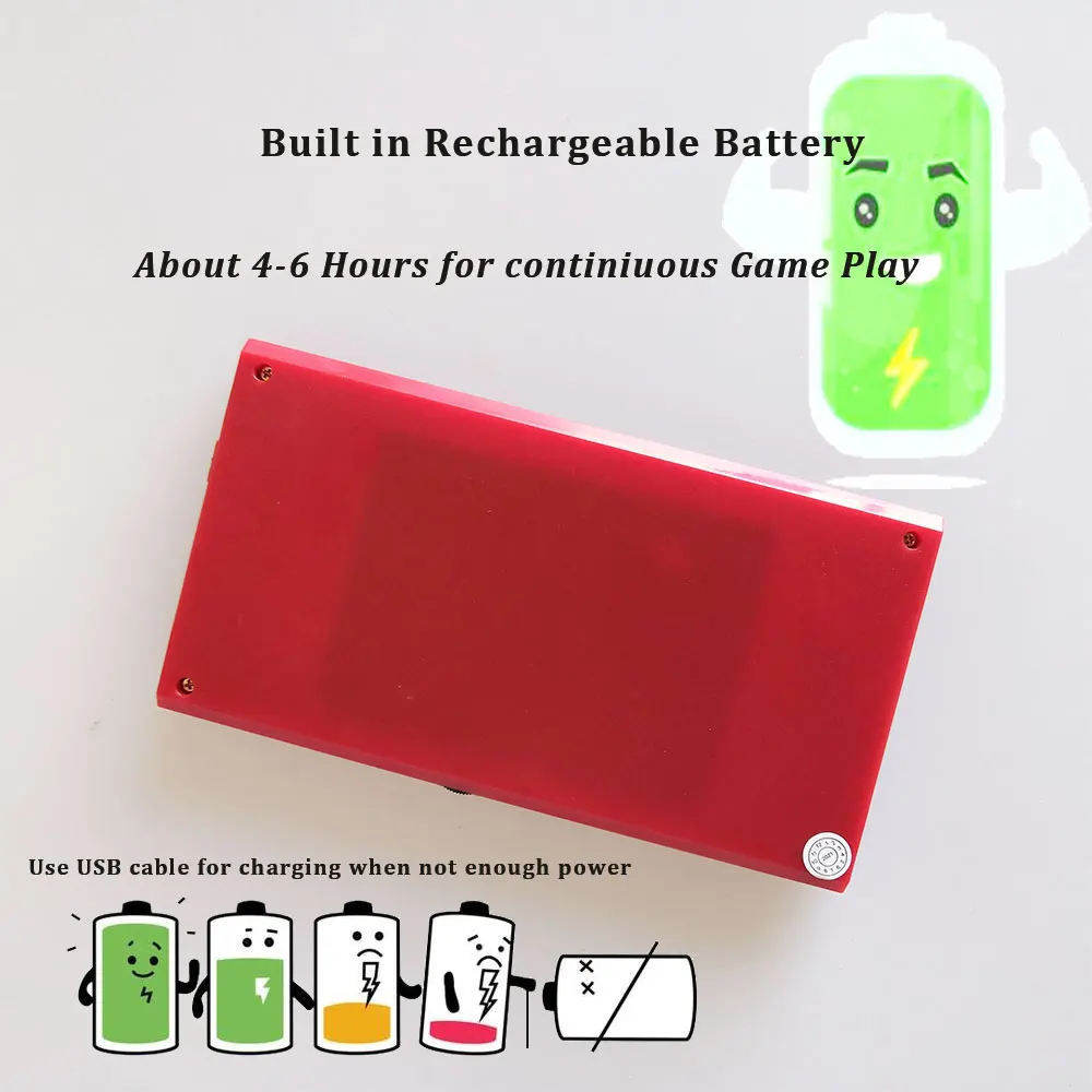 Портативная игровая консоль питается от литиевой батареи. Перезаряжаемая литиевая батарея встроена в консоль. Его нельзя заменить. Это около 4-6 часов для непрерывной игры. Поддерживает usb-кабель для зарядки, когда не хватает мощности.