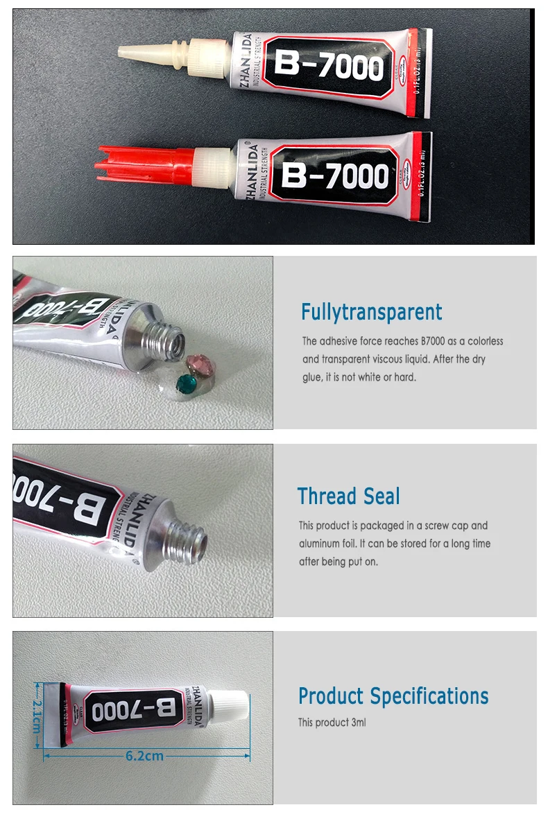 B7000-высокопрочный мягкий медленно сохнущий клей. Может быть соединен с металлом, стеклом, резиной, пластиком, тканью и другими материалами.