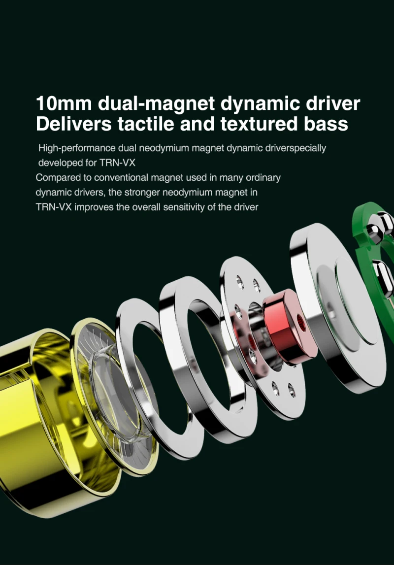 Точная внутренняя акустическая конструкция, TRN-VX добавляет физическую технологию деления частоты на основе сопротивления-емкостного частотного деления наушников, И трехчастотное соединение TRN-VX более плавное и спокойное, постоянно регулируя расположение устройства и воздуховода.