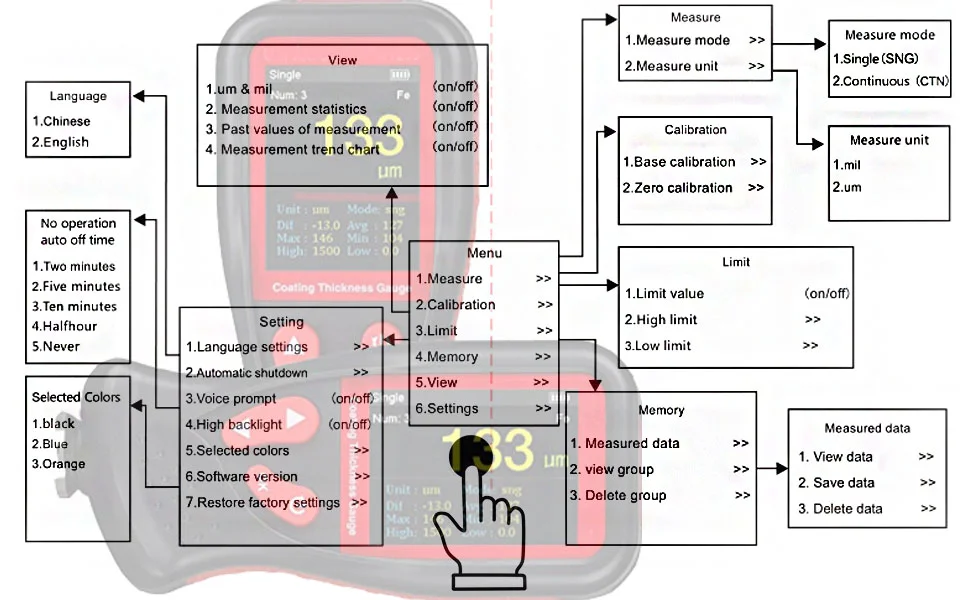 【Напоминание о пороге 】датчик толщины покрытия может быть установлен на высоком/низком уровне измерения, если переключатель предельного значения включен, Когда измеренное значение выше высокого предела или ниже низкого предела, который вы указали, значение станет красным, и появится соответствующий значок.
