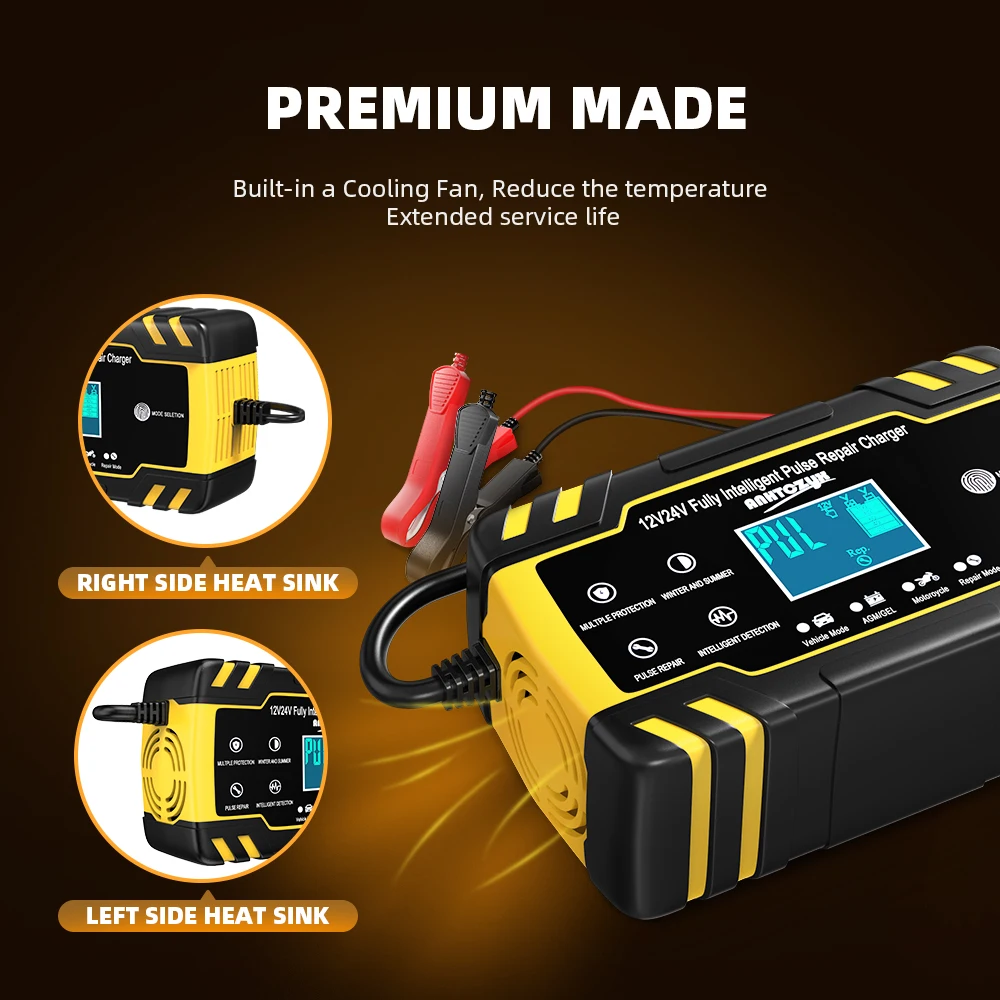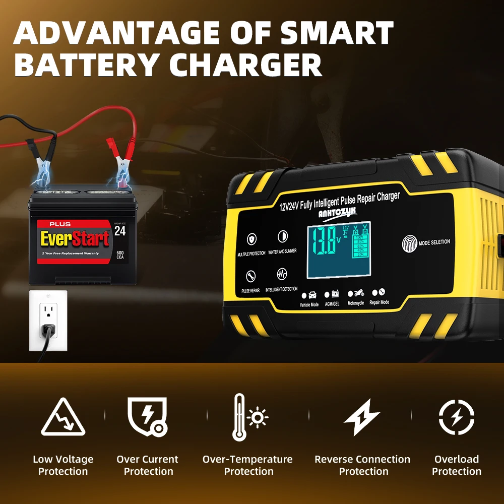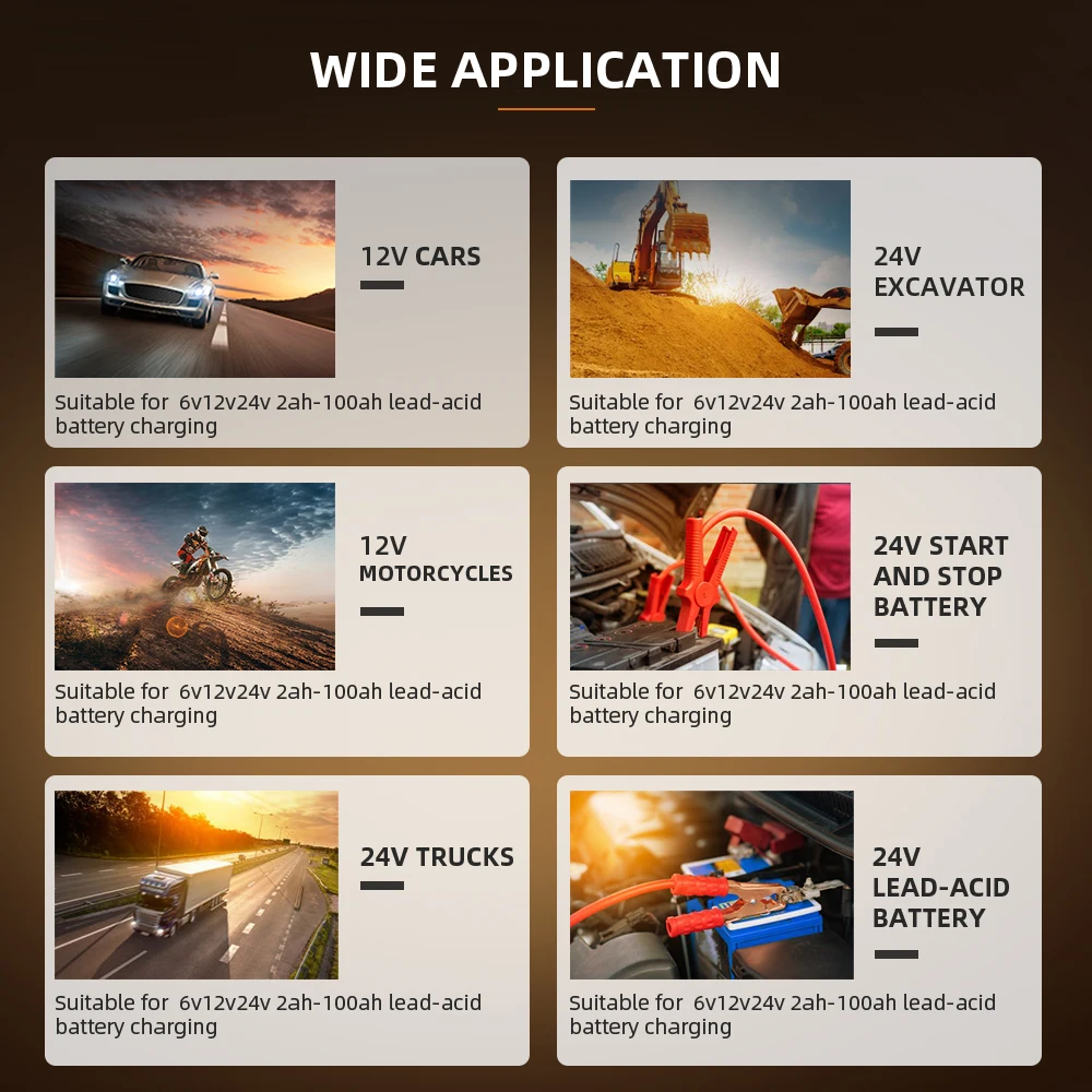 5. Зарядные устройства подходят для большинства типов свинцово-кислотных аккумуляторов, включая кальций, гель и AGM, мокрый, EFB и т. д.