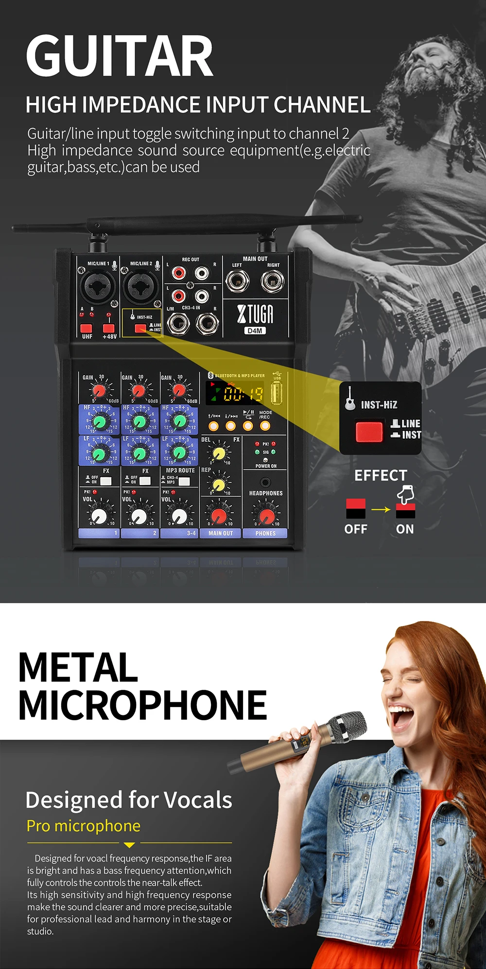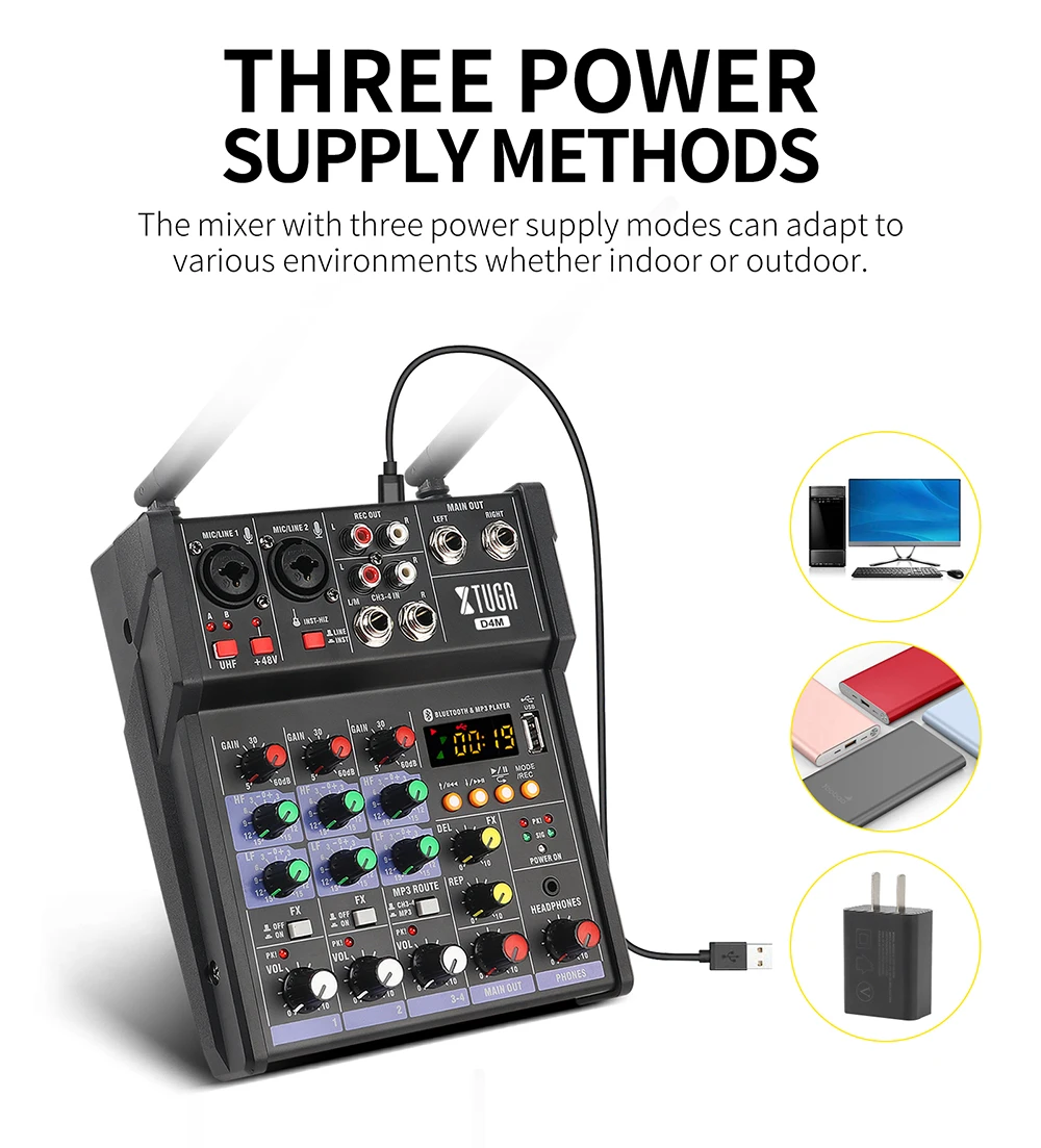 D4M-это Миксер небольшого размера с 2 микрофонами UHF, встроенной фантомной мощностью 48 В, высокоимпедансным гитарным усилителем, Bluetooth/mp3-плеером, компьютерной звуковой картой, эффектором и т. д.