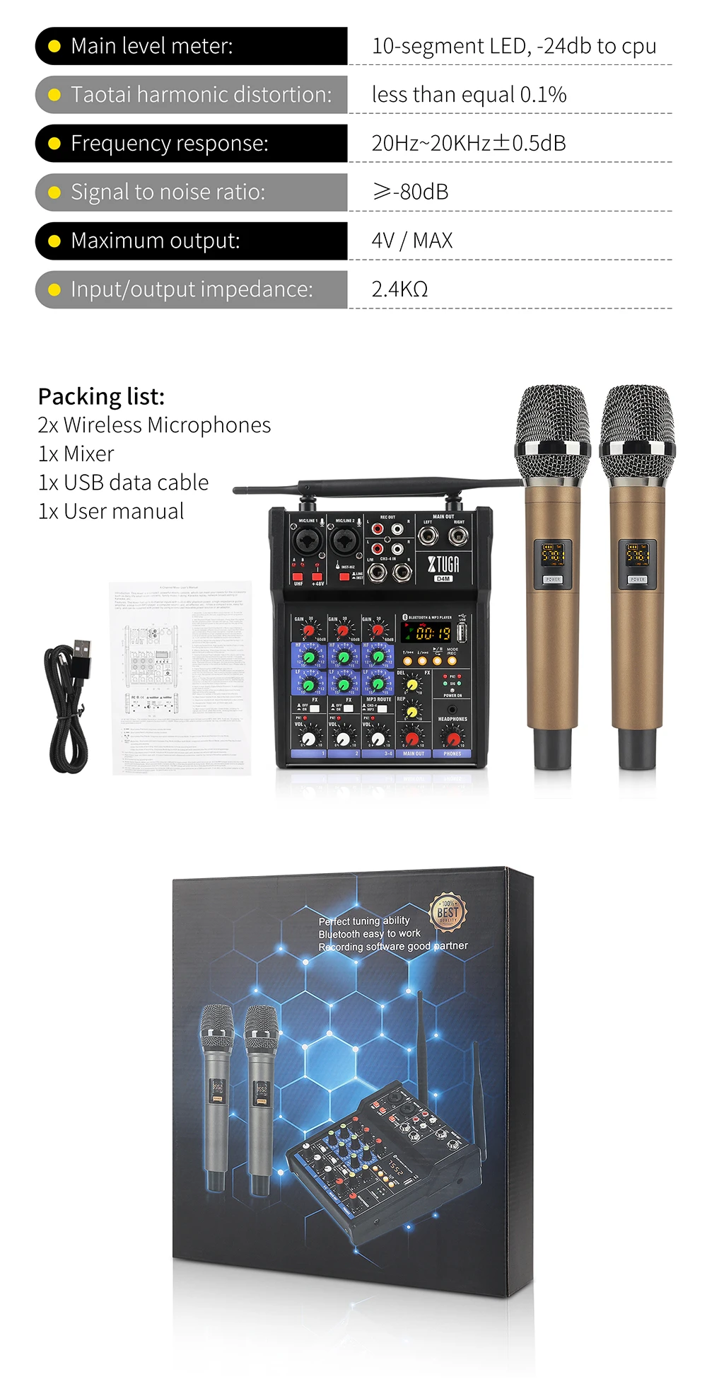 XTUGA D4M аудио Миксер с беспроводным микрофоном 4 канала